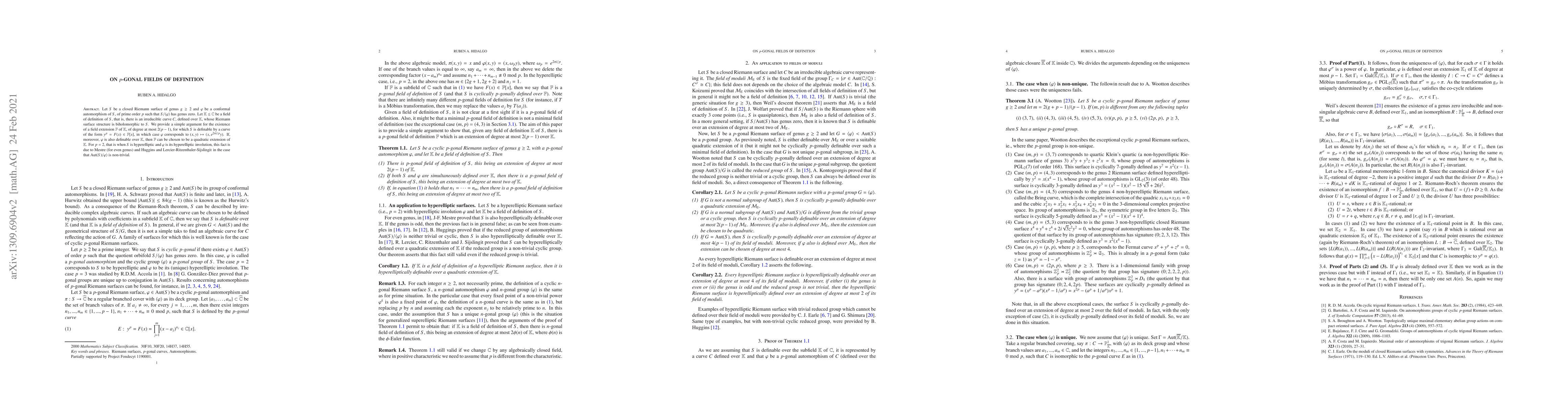 Let $S$ be a closed Riemann surface of genus $g \geq 2$ and $\varphi$ be a conformal automorphism of $S$, of prime order $p$ such that $S/\langle \varphi \rangle$ has genus zero. Let ${\mathbb K} \leq {\mathbb C}$ be a field of definition of $S$, that is, there is an irreducible curve $C$, defined over ${\mathbb K}$, whose Riemann surface structure is biholomorphic to $S$. We provide a simple argument for the existence of a field extension ${\mathbb F}$ of ${\mathbb K}$, of degree at most $2(p-1)$, for which $S$ is definable by a curve of the form $y^{p}=F(x) \in {\mathbb F}[x]$, in which case $\varphi$ corresponds to $(x,y) \mapsto (x,e^{2 \pi i/p} y)$. If, moreover, $\varphi$ is also definable over ${\mathbb K}$, then ${\mathbb F}$ can be chosen to be a quadratic extension of ${\mathbb K}$. For $p=2$, that is when $S$ is hyperelliptic and $\varphi$ is its hyperelliptic involution, this fact is due to Mestre (for even genus) and Huggins and Lercier-Ritzenthaler-Sijslingit in the case that ${\rm Aut}(S)/\varphi\rangle$ is non-trivial.
