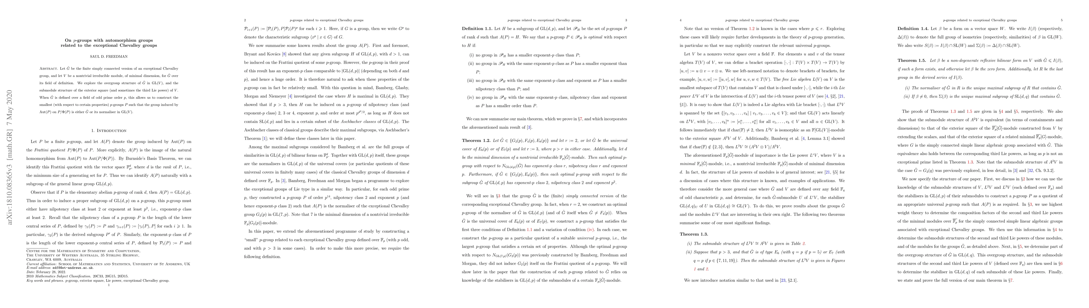 Let $\hat G$ be the finite simply connected version of an exceptional Chevalley group, and let $V$ be a nontrivial irreducible module, of minimal dimension, for $\hat G$ over its field of definition. We explore the overgroup structure of $\hat G$ in $\mathrm{GL}(V)$, and the submodule structure of the exterior square (and sometimes the third Lie power) of $V$. When $\hat G$ is defined over a field of odd prime order $p$, this allows us to construct the smallest (with respect to certain properties) $p$-groups $P$ such that the group induced by $\mathrm{Aut}(P)$ on $P/\Phi(P)$ is either $\hat G$ or its normaliser in $\mathrm{GL}(V)$.