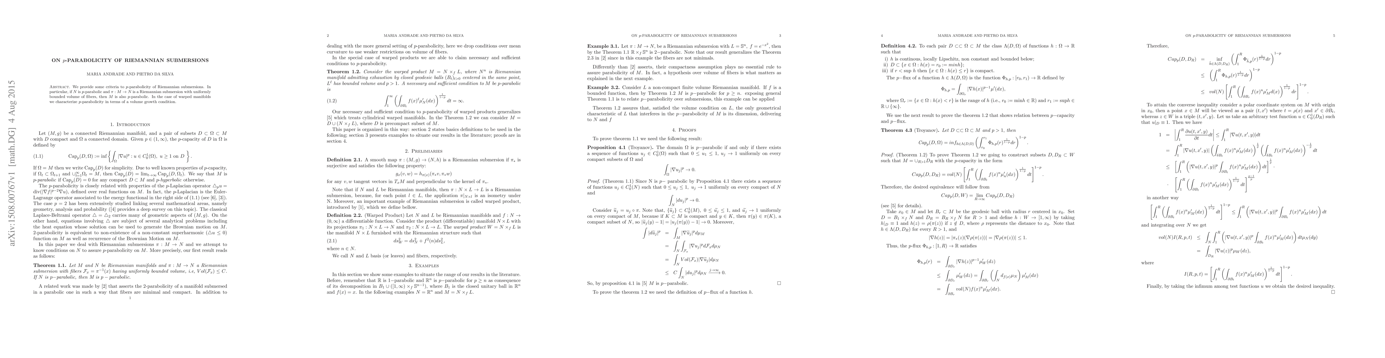 This paper establishes criteria for $p$-parabolicity in Riemannian submersions, showing that if the base $N$ is $p$-parabolic and the submersion $\pi:M\to N$ has uniformly bounded fiber volumes, then $M$ is also $p$-parabolic. For warped manifolds, it characterizes $p$-parabolicity through a specific volume growth condition.