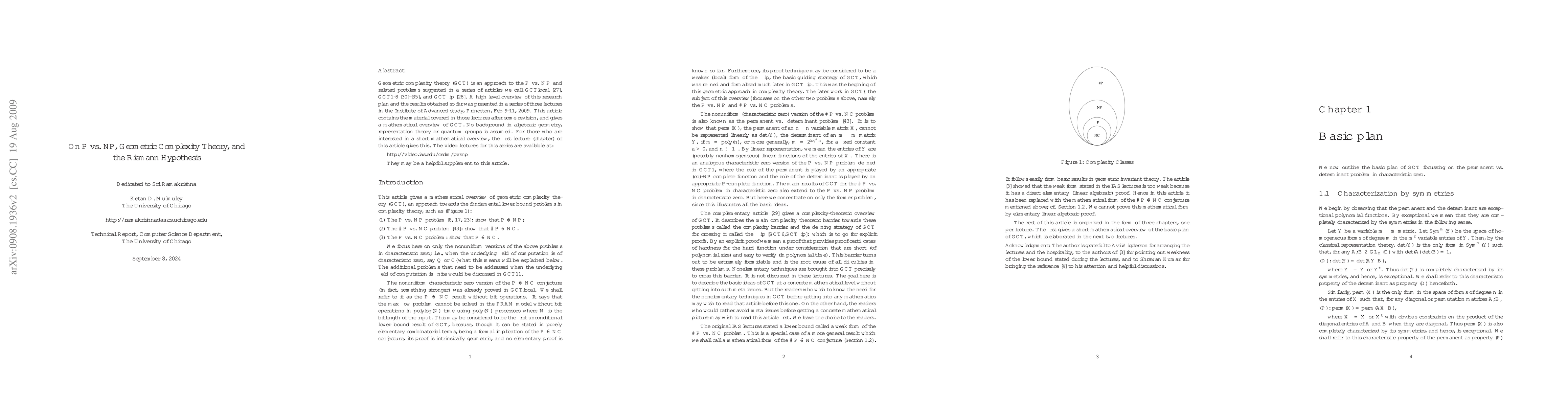 Geometric complexity theory (GCT) is an approach to the $P$ vs. $NP$ and related problems. A high level overview of this research plan and the results obtained so far was presented in a series of three lectures in the Institute of Advanced study, Princeton, Feb 9-11, 2009. This article contains the material covered in those lectures after some revision, and gives a mathematical overview of GCT. No background in algebraic geometry, representation theory or quantum groups is assumed.