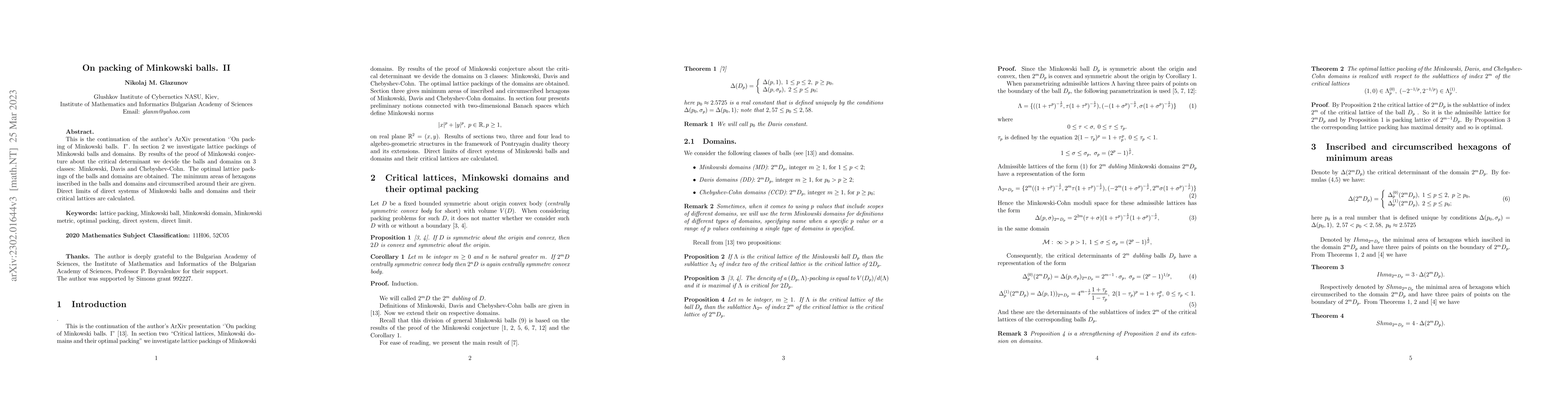 This paper continues the study of lattice packings of Minkowski balls and domains, classifying them into Minkowski, Davis, and Chebyshev-Cohn classes based on the proof of the Minkowski conjecture. It presents optimal lattice packings and calculates the minimum areas of inscribed hexagons and circumscribed areas.