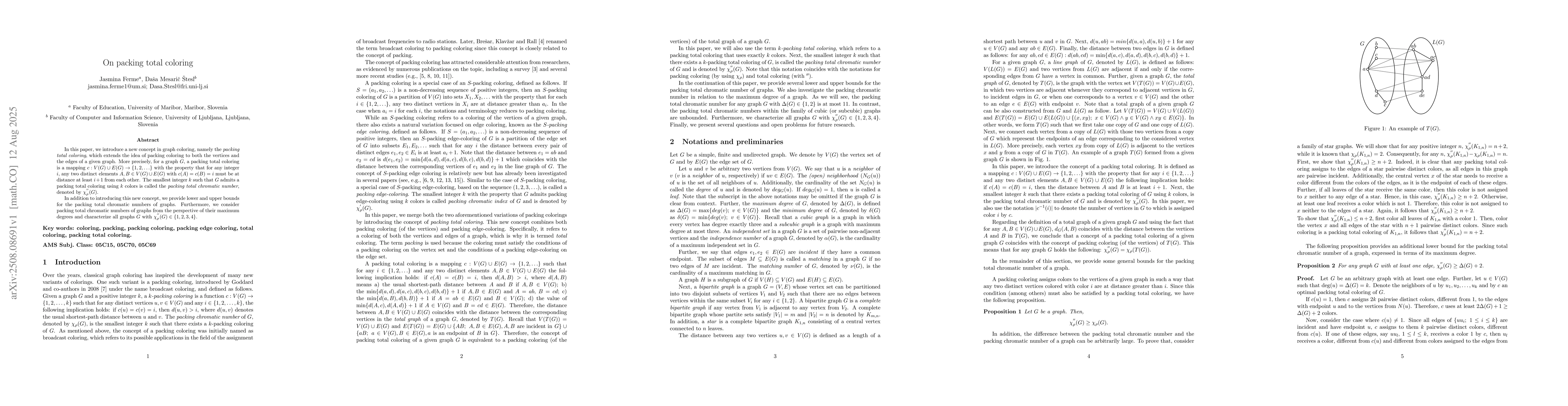 In this paper, we introduce a new concept in graph coloring, namely the \textit{packing total coloring}, which extends the idea of packing coloring to both the vertices and the edges of a given graph. More precisely, for a graph $G$, a packing total coloring is a mapping $c: V(G) \cup E(G) \rightarrow \{1, 2, \ldots\}$ with the property that for any integer $i$, any two distinct elements $A, B \in V(G) \cup E(G)$ with $c(A) = c(B) = i$ must be at distance at least $i+1$ from each other. The smallest integer $k$ such that $G$ admits a packing total coloring using $k$ colors is called the \textit{packing total chromatic number}, denoted by $\chi_\rho^{''}(G)$. In addition to introducing this new concept, we provide lower and upper bounds for the packing total chromatic numbers of graphs. Furthermore, we consider packing total chromatic numbers of graphs from the perspective of their maximum degrees and characterize all graphs $G$ with $\chi_\rho^{''}(G) \in \{1, 2, 3, 4\}$.