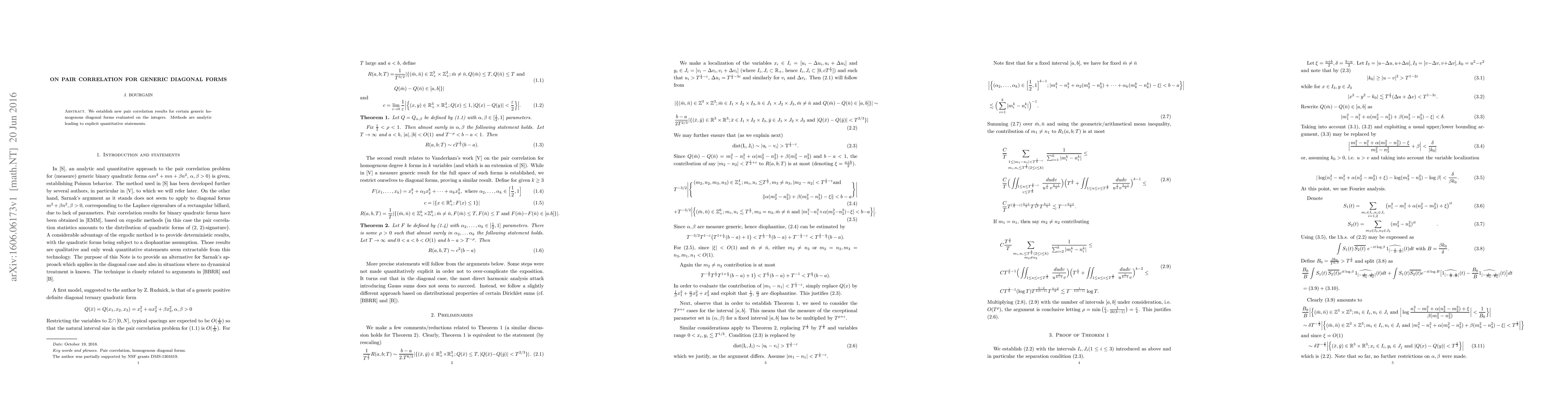 This paper establishes pair correlation results for generic diagonal forms using analytic methods, providing explicit quantitative statements.