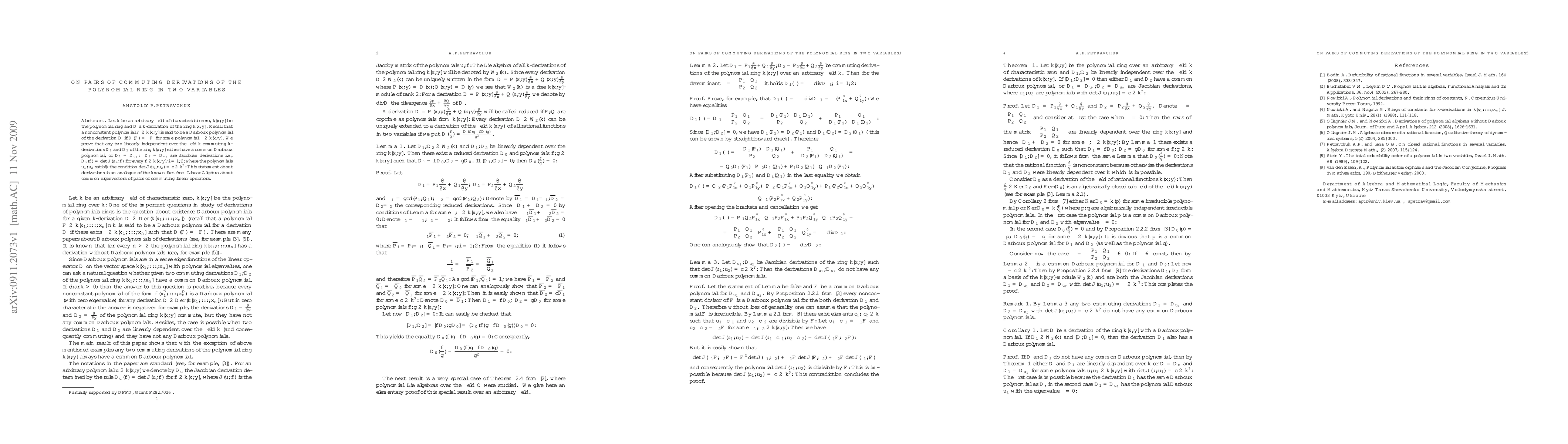 Let $k$ be an arbitrary field of characteristic zero, $k[x, y]$ be the polynomial ring and $D$ a $k$-derivation of the ring $k[x, y]$. Recall that a nonconstant polynomial $F\in k[x, y]$ is said to be a Darboux polynomial of the derivation $D$ if $D(F)=\lambda F$ for some polynomial $\lambda \in k[x, y]$. We prove that any two linearly independent over the field $k$ commuting $k$-derivations $D_{1}$ and $D_{2}$ of the ring $k[x, y]$ either have a common Darboux polynomial, or $D_{1}=D_{u_{1}}, D_{2}=D_{u_{2}}$ are Jacobian derivations i.e., $D_{i}(f)=\det J(u_{i}, f)$ for every $f\in k[x, y], i=1, 2,$ where the polynomials $u_{1}, u_{2}$ satisfy the condition $\det J(u_{1}, u_{2})=c\in k^{\star}.$ This statement about derivations is an analogue of the known fact from Linear Algebra about common eigenvectors of pairs of commuting linear operators.