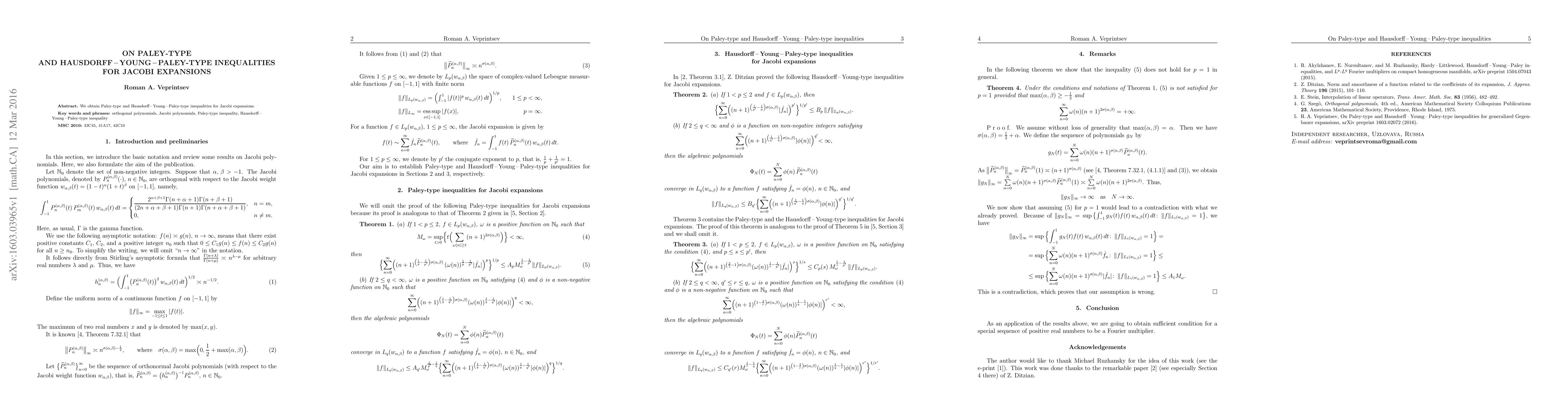 Summary: This paper establishes Paley-type and Hausdorff-Young-Paley-type inequalities specifically for Jacobi expansions, providing new insights into the boundedness properties of these expansions.