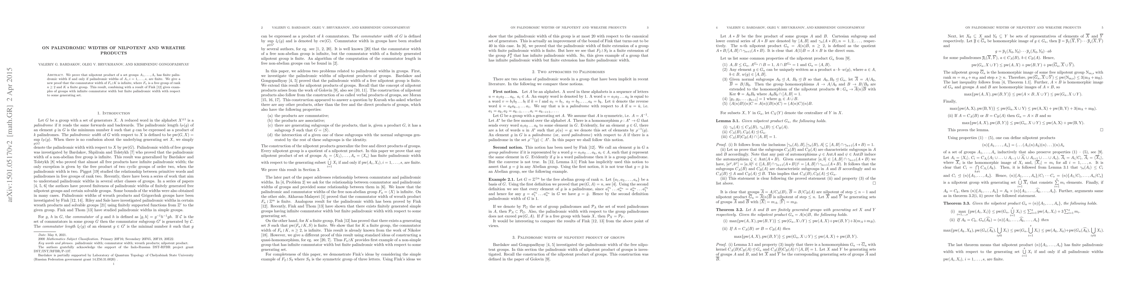We prove that the nilpotent product of a set of groups $A_{1},\dots, A_{s}$ has finite palindromic width if and only if the palindromic widths of $A_{i}, i=1,\dots, s,$ are finite. We give a new proof that the commutator width of $F_n \wr K$ is infinite, where $F_n$ is a free group of rank $n \geq 2$ and $K$ a finite group. This result, combining with a result of Fink \cite{f1} gives examples of groups with infinite commutator width but finite palindromic width with respect to some generating set.