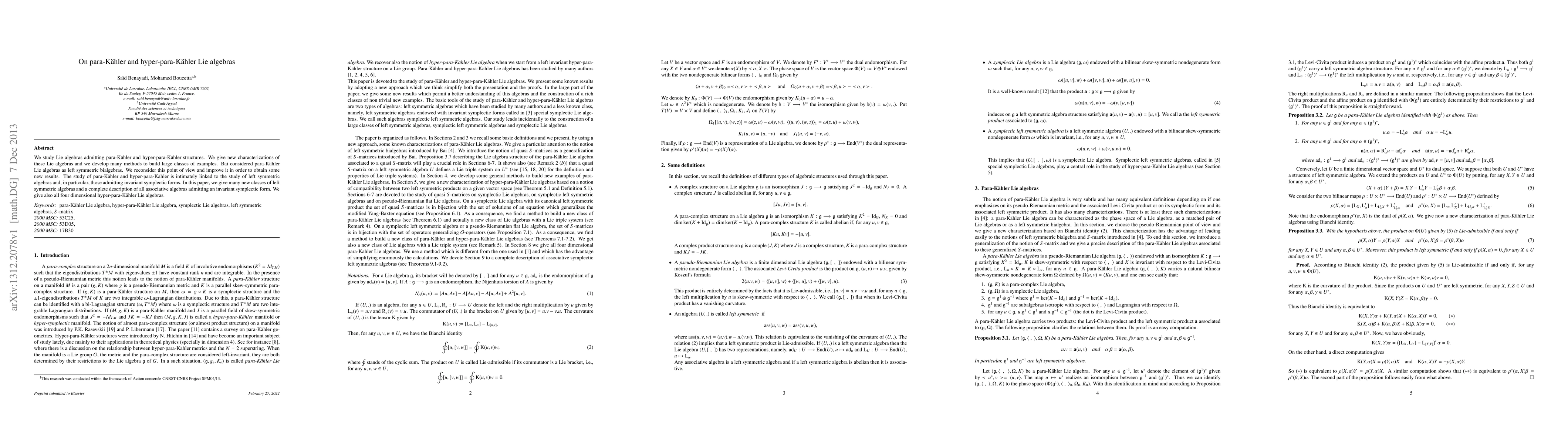 This paper characterizes para-Kähler and hyper-para-Kähler Lie algebras, develops new methods to build examples, and links these structures to left symmetric algebras with invariant symplectic forms, providing complete descriptions of relevant algebras.