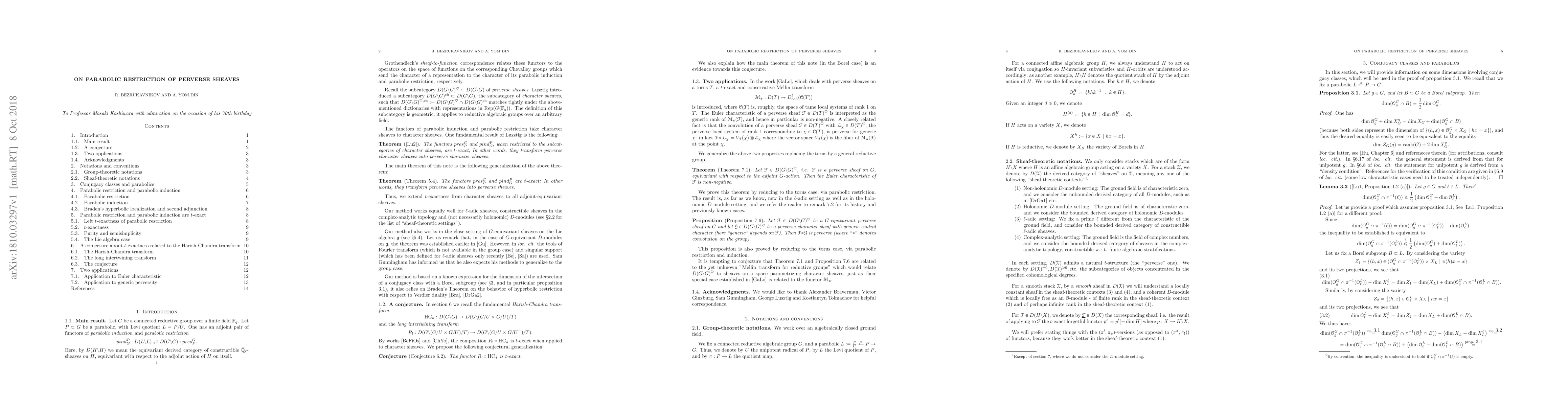 This paper proves the exactness of parabolic restriction and induction functors for conjugation equivariant sheaves on reductive groups, extending Lusztig's result for character sheaves, and presents evidence supporting a conjectured t-exactness property of the Harish-Chandra transform. It also generalizes Gabber and Loeser's results on perverse sheaves on algebraic tori to arbitrary reductive groups.