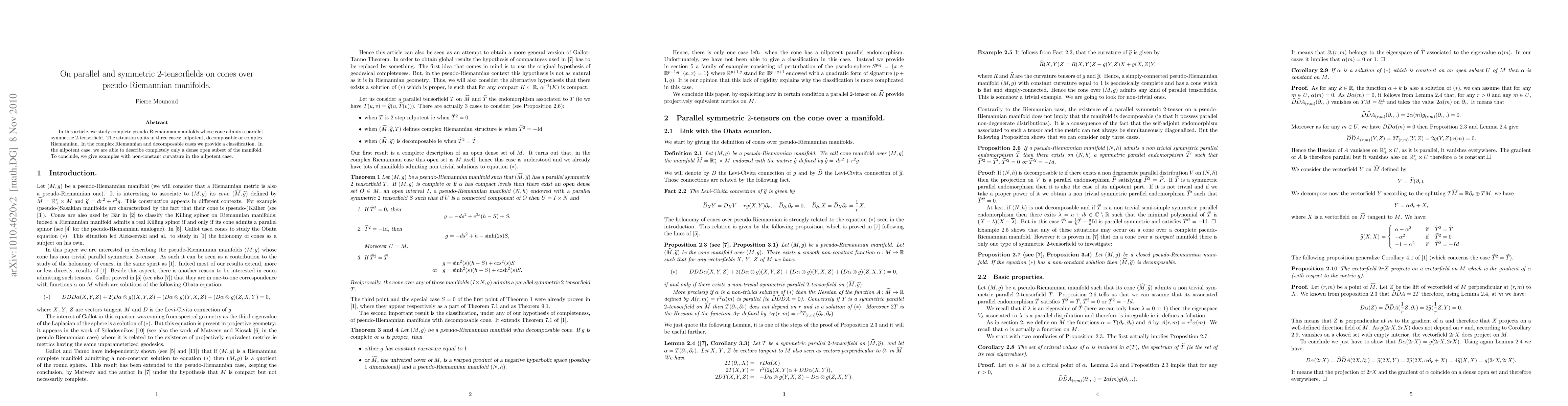 In this article, we study complete pseudo-Riemannian manifolds whose cone admits a parallel symmetric 2-tensorfield. The situation splits in three cases: nilpotent, decomposable or complex Riemannian. In the complex Riemannian and decomposable cases we provide a classification. In the nilpotent case, we are able to describe completely only a dense open subset of the manifold. To conclude, we give examples with non-constant curvature in the nilpotent case.