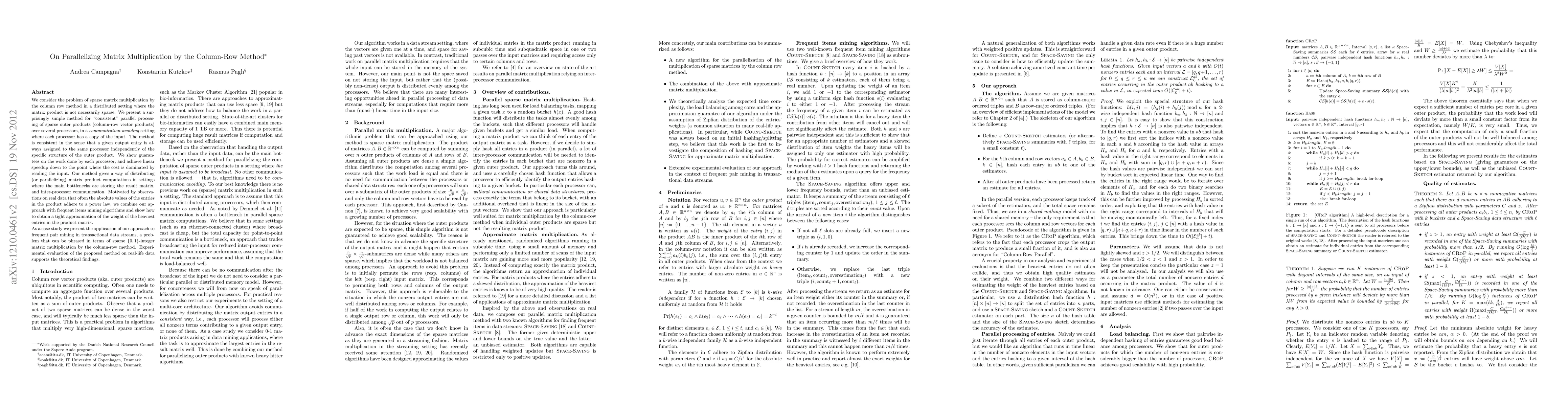 We consider the problem of sparse matrix multiplication by the column row method in a distributed setting where the matrix product is not necessarily sparse. We present a surprisingly simple method for "consistent" parallel processing of sparse outer products (column-row vector products) over several processors, in a communication-avoiding setting where each processor has a copy of the input. The method is consistent in the sense that a given output entry is always assigned to the same processor independently of the specific structure of the outer product. We show guarantees on the work done by each processor, and achieve linear speedup down to the point where the cost is dominated by reading the input. Our method gives a way of distributing (or parallelizing) matrix product computations in settings where the main bottlenecks are storing the result matrix, and inter-processor communication. Motivated by observations on real data that often the absolute values of the entries in the product adhere to a power law, we combine our approach with frequent items mining algorithms and show how to obtain a tight approximation of the weight of the heaviest entries in the product matrix. As a case study we present the application of our approach to frequent pair mining in transactional data streams, a problem that can be phrased in terms of sparse ${0,1}$-integer matrix multiplication by the column-row method. Experimental evaluation of the proposed method on real-life data supports the theoretical findings.
