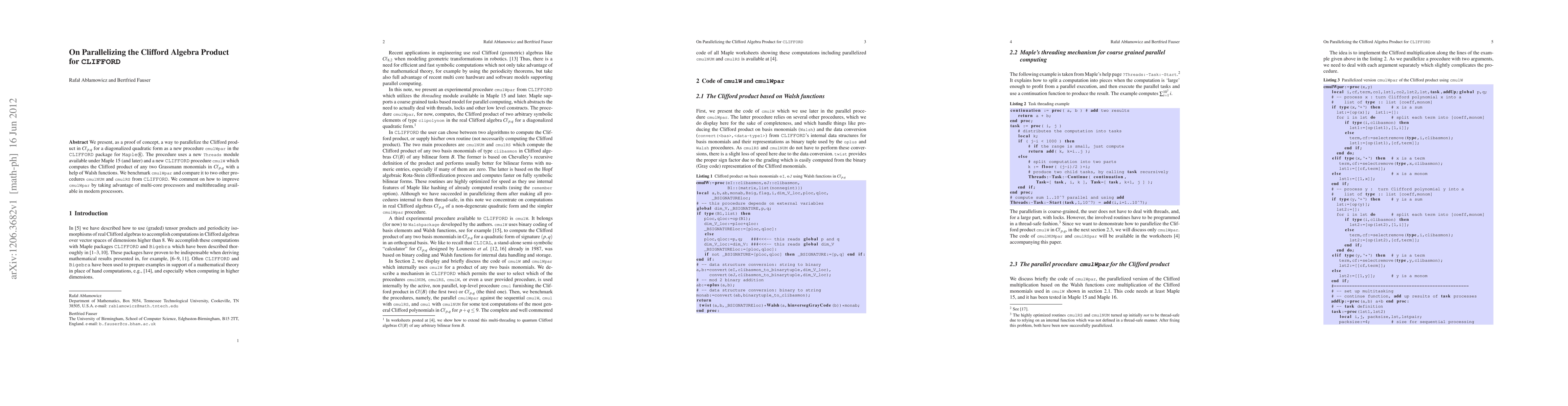 We present, as a proof of concept, a way to parallelize the Clifford product in CL_{p,q} for a diagonalized quadratic form as a new procedure `cmulWpar' in the \Clifford package for \Maple(R). The procedure uses a new `Threads' module available under Maple 15 (and later) and a new \Clifford procedure `cmulW' which computes the Clifford product of any two Grassmann monomials in \CL_{p,q} with a help of Walsh functions. We benchmark `cmulWpar' and compare it to two other procedures `cmulNUM' and `cmulRS' from \Clifford. We comment on how to improve `cmulWpar' by taking advantage of multi-core processors and multithreading available in modern processors.