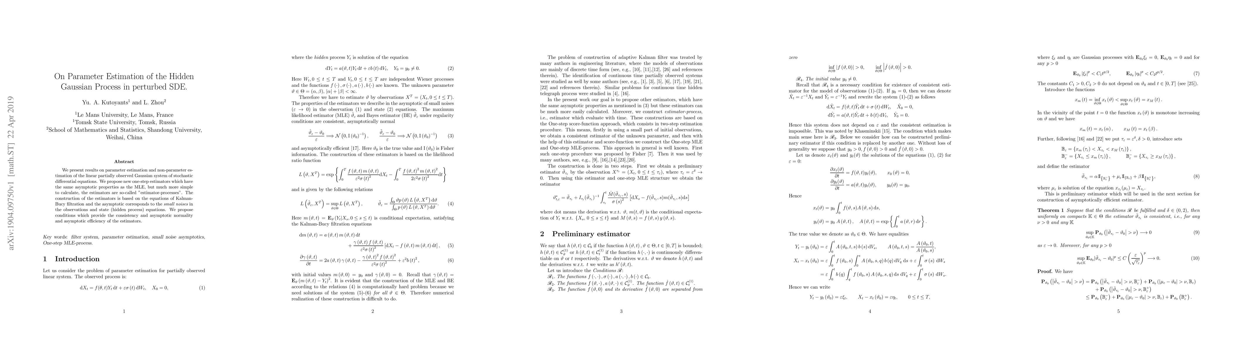 We present results on parameter estimation and non-parameter estimation of the linear partially observed Gaussian system of stochastic differential equations. We propose new one-step estimators which have the same asymptotic properties as the MLE, but much more simple to calculate, the estimators are so-called "estimator-processes". The construction of the estimators is based on the equations of Kalman-Bucy filtration and the asymptotic corresponds to the small noises in the observations and state (hidden process) equations. We propose conditions which provide the consistency and asymptotic normality and asymptotic efficiency of the estimators.