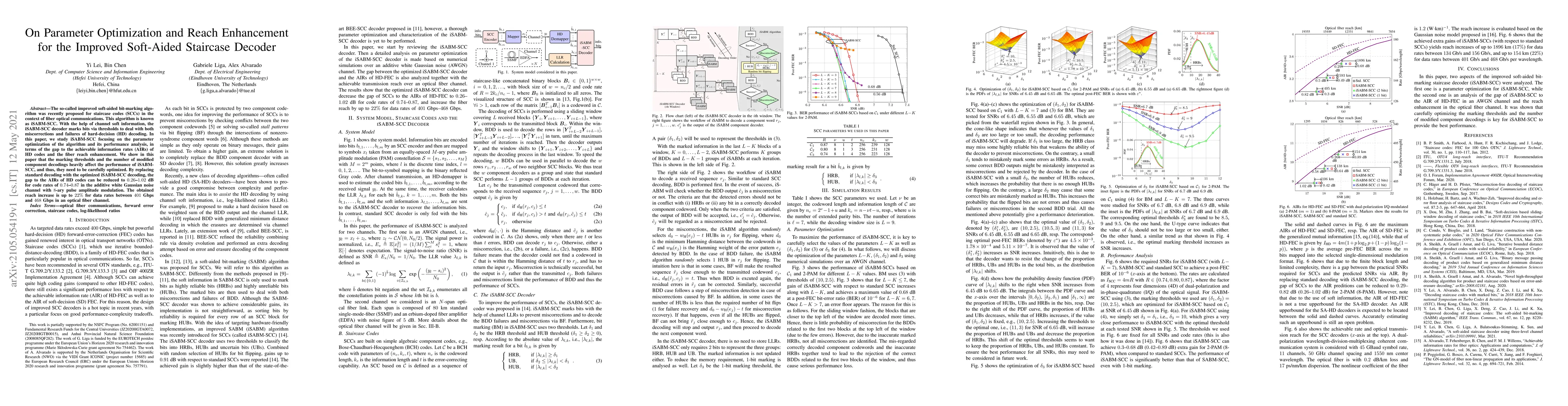 This paper optimizes the improved soft-aided bit-marking algorithm (iSABM-SCC) for staircase codes in fiber optical communications, focusing on reducing the gap to achievable information rates and enhancing fiber reach. Optimized thresholds and decodings improve performance, achieving up to a 22% reach increase for data rates between 401 Gbps and 468 Gbps.
