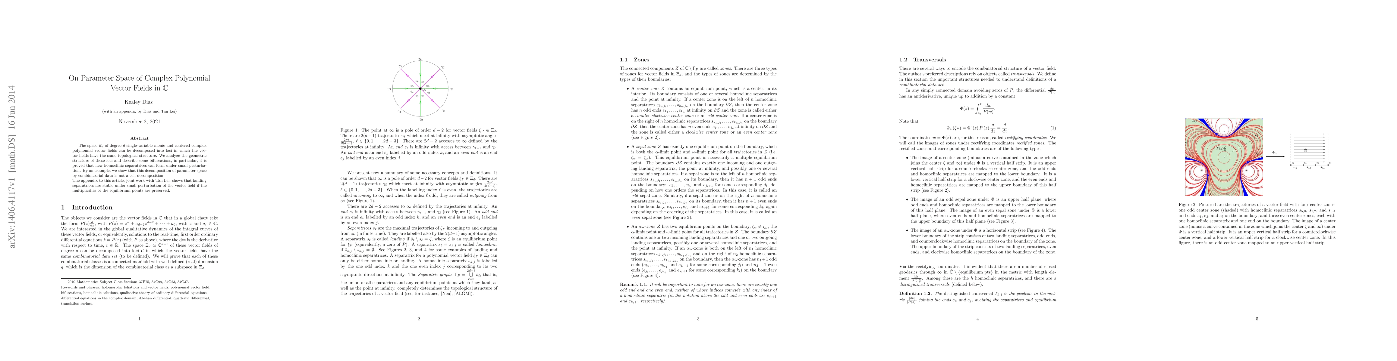 The space of degree d single-variable monic and centered complex polynomial vector fields can be decomposed into loci in which the vector fields have the same topological structure. We analyze the geometric structure of these loci and describe some bifurcations, in particular, it is proved that new homoclinic separatrices can form under small perturbation. By an example, we show that this decomposition of parameter space by combinatorial data is not a cell decomposition. The appendix to this article, joint work with Tan Lei, shows that landing separatrices are stable under small perturbation of the vector field if the multiplicities of the equilibrium points are preserved.