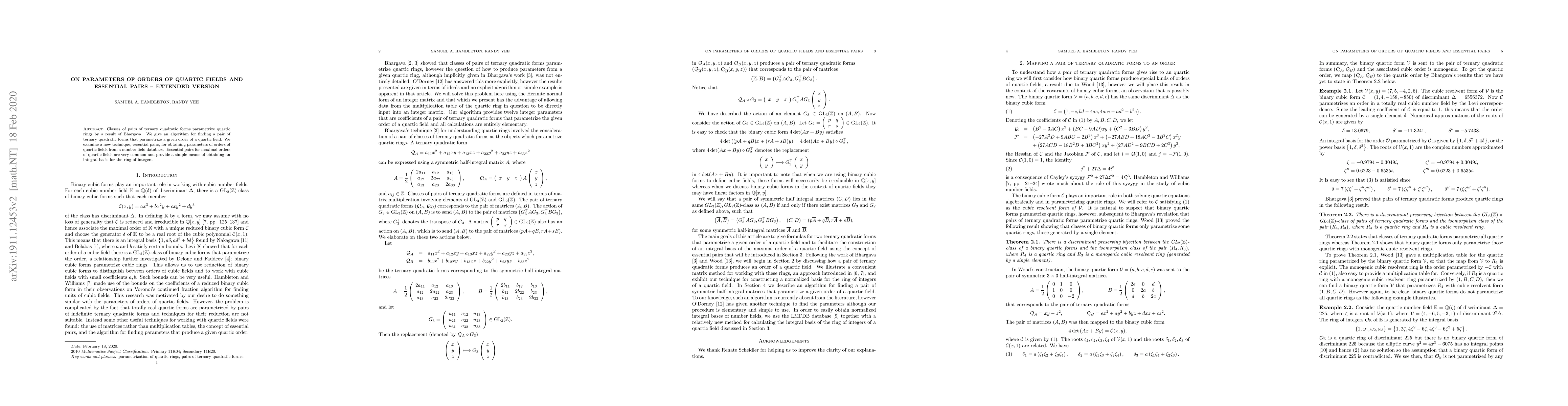 Summary: This paper presents an algorithm to find ternary quadratic form pairs that parametrize given quartic field orders and introduces "essential pairs" as a new technique for extracting parameters from number field databases, which simplifies obtaining integral bases for maximal orders.
