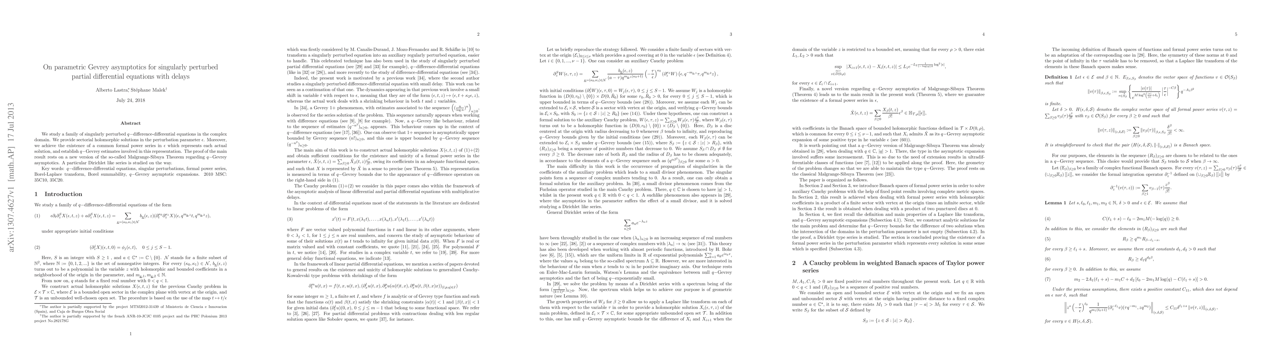We study a family of singularly perturbed $q-$difference-differential equations in the complex domain. We provide sectorial holomorphic solutions in the perturbation parameter $\epsilon$. Moreover, we achieve the existence of a common formal power series in $\epsilon$ which represents each actual solution, and establish $q-$Gevrey estimates involved in this representation. The proof of the main result rests on a new version of the so-called Malgrange-Sibuya Theorem regarding $q-$Gevrey asymptotics. A particular Dirichlet like series is studied on the way.