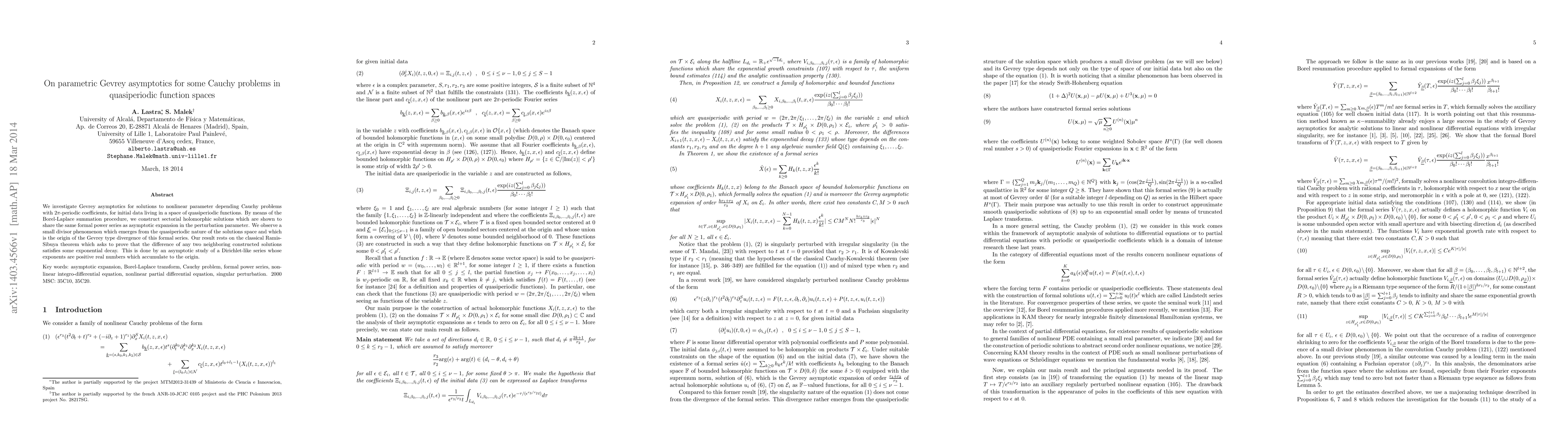This paper explores Gevrey asymptotics for solutions to nonlinear Cauchy problems with quasiperiodic functions, constructing sectorial holomorphic solutions via Borel-Laplace summation. It identifies a small divisor phenomenon causing Gevrey type divergence, relying on the Ramis-Sibuya theorem to prove exponential decay between neighboring solutions.