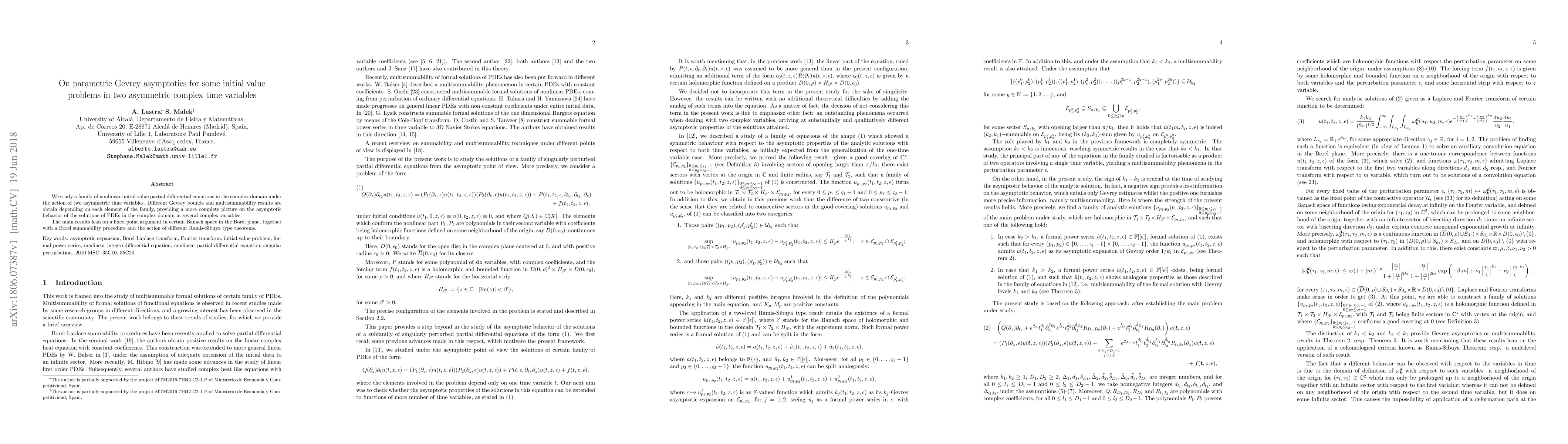 This paper investigates nonlinear initial value partial differential equations in the complex domain under two asymmetric time variables, deriving Gevrey bounds and multisummability results for different problem families. The study uses a fixed point argument in Banach space, Borel summability, and Ramis-Sibuya theorems to elucidate the asymptotic behavior of solutions.