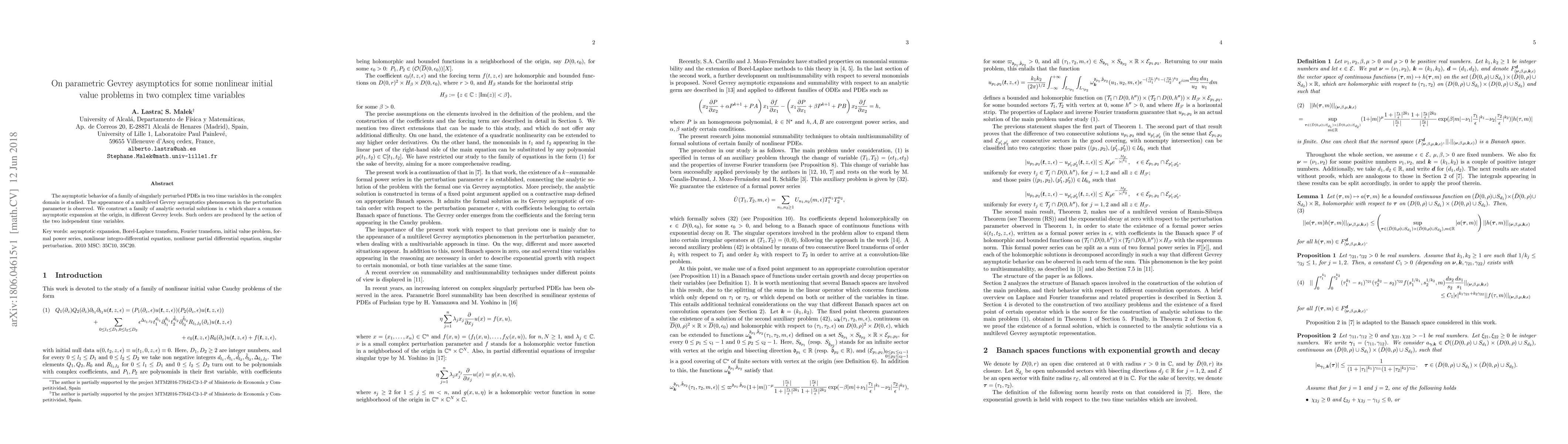 This paper investigates the asymptotic behavior of singularly perturbed PDEs in two complex time variables, revealing a multilevel Gevrey asymptotics phenomenon. The authors construct analytic sectorial solutions with a common asymptotic expansion at the origin, exhibiting different Gevrey levels influenced by the two independent time variables.