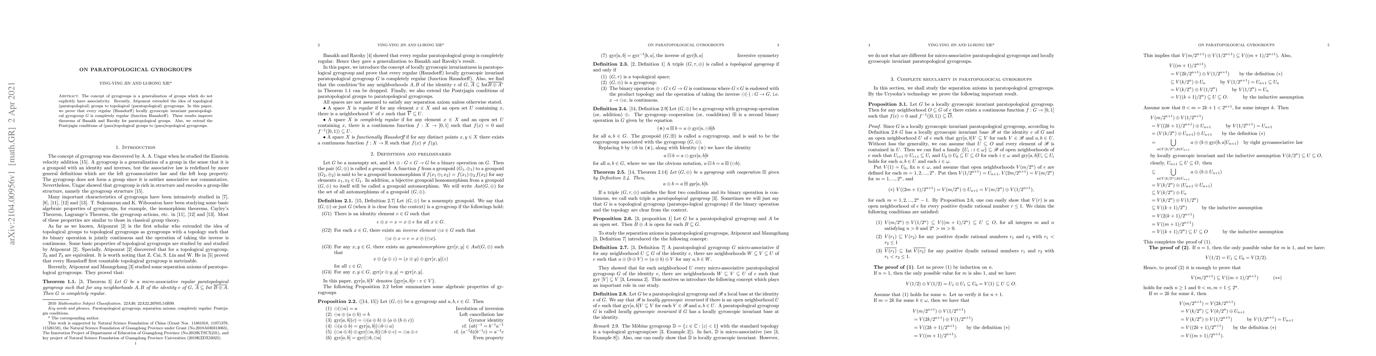 This paper proves that regular, locally gyroscopic invariant paratopological gyrogroups are completely regular, enhancing previous theorems for paratopological groups. It also extends Pontrjagin conditions to (para)topological gyrogroups, contributing to the generalization of group theory.