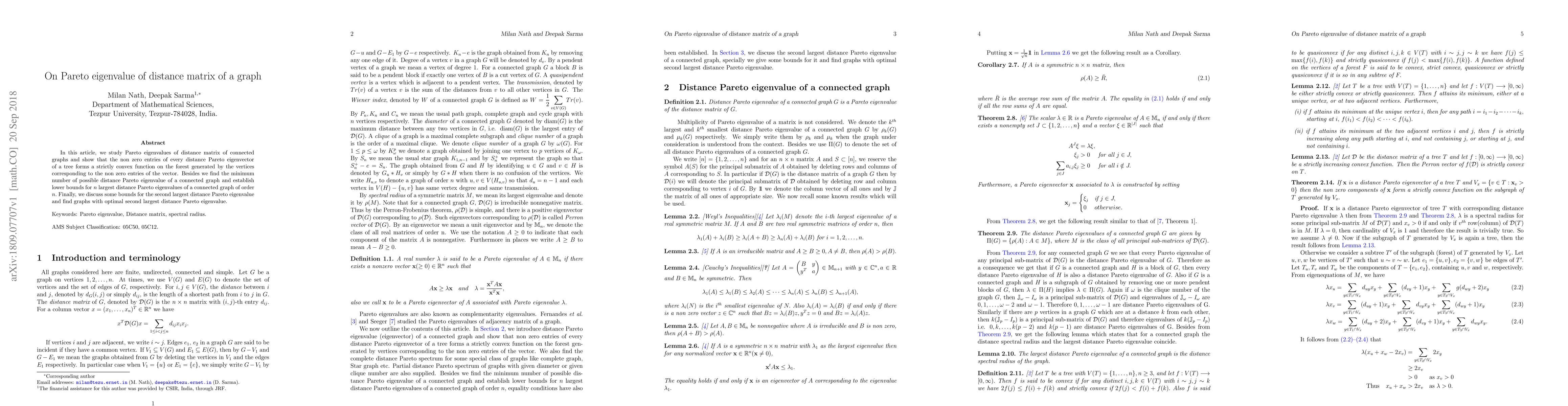 In this article, we study Pareto eigenvalues of distance matrix of connected graphs and show that the non zero entries of every distance Pareto eigenvector of a tree forms a strictly convex function on the forest generated by the vertices corresponding to the non zero entries of the vector. Besides we find the minimum number of possible distance Pareto eigenvalue of a connected graph and establish lower bounds for $n$ largest distance Pareto eigenvalues of a connected graph of order $n.$ Finally, we discuss some bounds for the second largest distance Pareto eigenvalue and find graphs with optimal second largest distance Pareto eigenvalue.