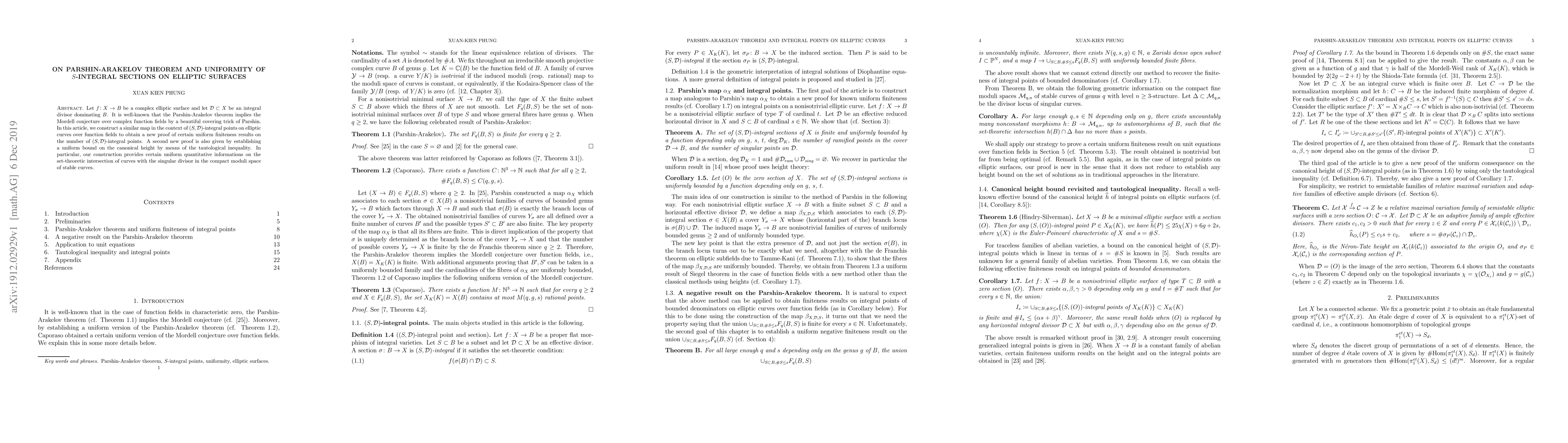 Let $f \colon X \to B$ be a complex elliptic surface and let $\DD \subset X$ be an integral divisor dominating $B$. It is well-known that the Parshin-Arakelov theorem implies the Mordell conjecture over complex function fields by a beautiful covering trick of Parshin. In this article, we construct a similar map in the context of $(S, \DD)$-integral points on elliptic curves over function fields to obtain a new proof of certain uniform finiteness results on the number of $(S, \DD)$-integral points. A second new proof is also given by establishing a uniform bound on the canonical height by means of the tautological inequality. In particular, our construction provides certain uniform quantitative informations on the set-theoretic intersection of curves with the singular divisor in the compact moduli space of stable curves.