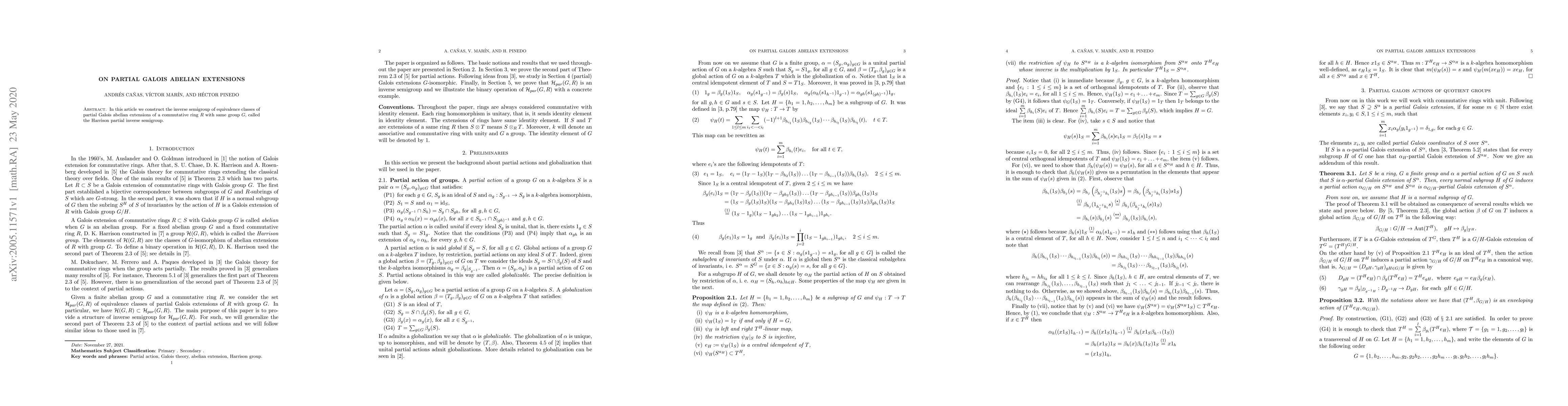 Summary: This paper constructs the Harrison partial inverse semigroup, an inverse semigroup representing equivalence classes of partial Galois abelian extensions of a commutative ring R sharing the same group G. The focus is on the structural properties and classification of these extensions.