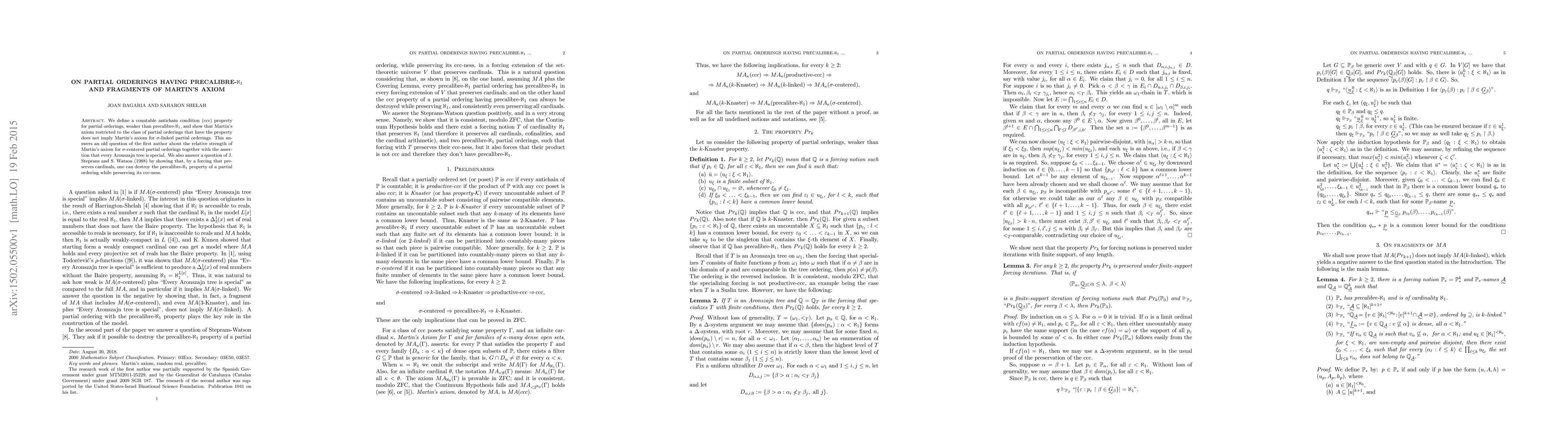 We define a countable antichain condition (ccc) property for partial orderings, weaker than precalibre-$\aleph_1$, and show that Martin's axiom restricted to the class of partial orderings that have the property does not imply Martin's axiom for $\sigma$-linked partial orderings. This answers an old question of the first author about the relative strength of Martin's axiom for $\sigma$-centered partial orderings together with the assertion that every Aronszajn tree is special. We also answer a question of J. Steprans and S. Watson (1988) by showing that, by a forcing that preserves cardinals, one can destroy the precalibre-$\aleph_1$ property of a partial ordering while preserving its ccc-ness.