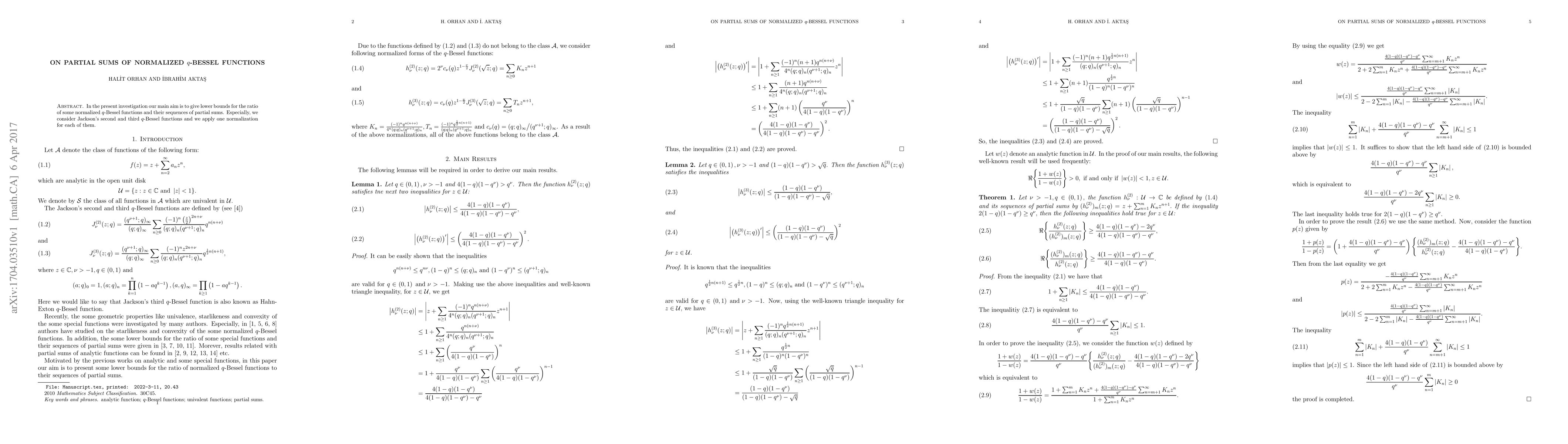 This paper investigates lower bounds for the ratio of normalized $q$-Bessel functions and their partial sums, focusing on Jackson's second and third $q$-Bessel functions with specific normalizations. The study aims to provide mathematical insights into these functions' behavior.