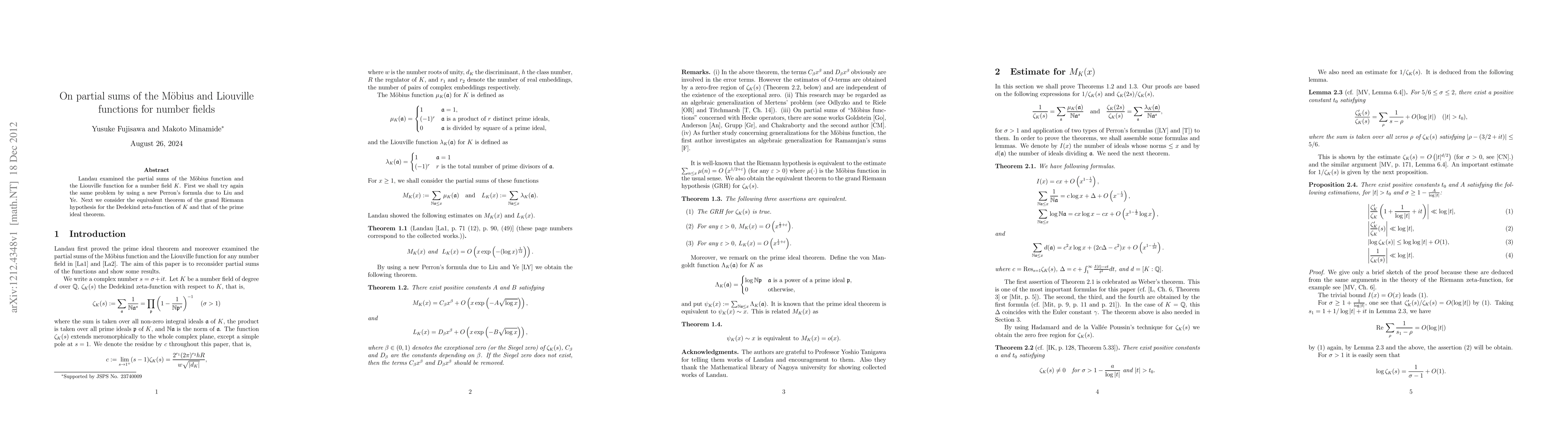 Landau examined the partial sums of the M\"obius function and the Liouville function for a number field $K$. First we shall try again the same problem by using a new Perron's formula due to Liu and Ye. Next we consider the equivalent theorem of the grand Riemann hypothesis for the Dedekind zeta-function of $K$ and that of the prime ideal theorem.