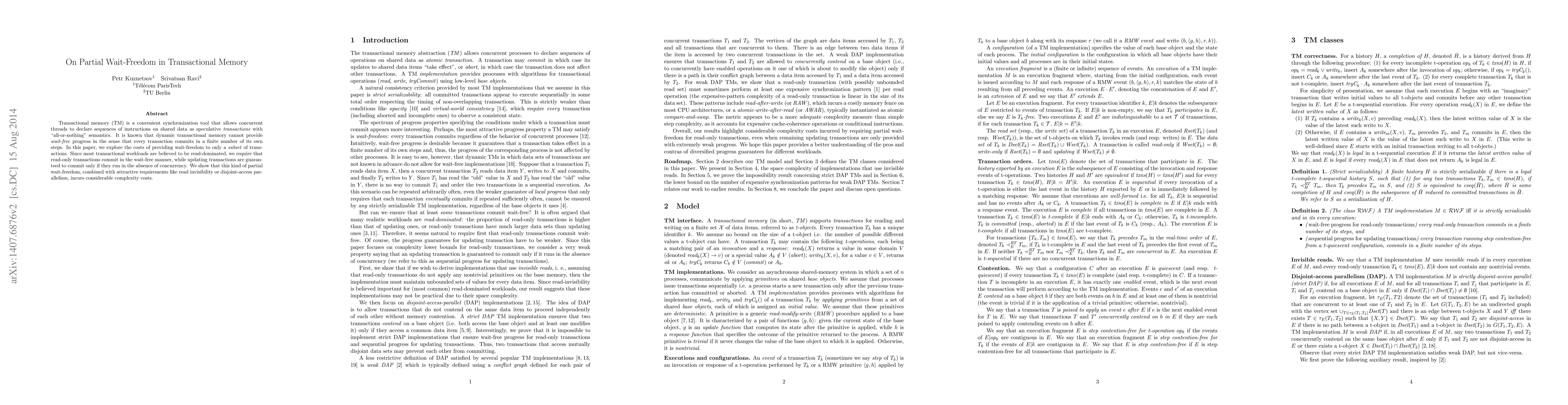 This paper investigates partial wait-freedom in transactional memory, focusing on ensuring that read-only transactions commit wait-free while updating transactions commit only without concurrency. It demonstrates that achieving this partial wait-freedom alongside other desirable properties significantly increases complexity.