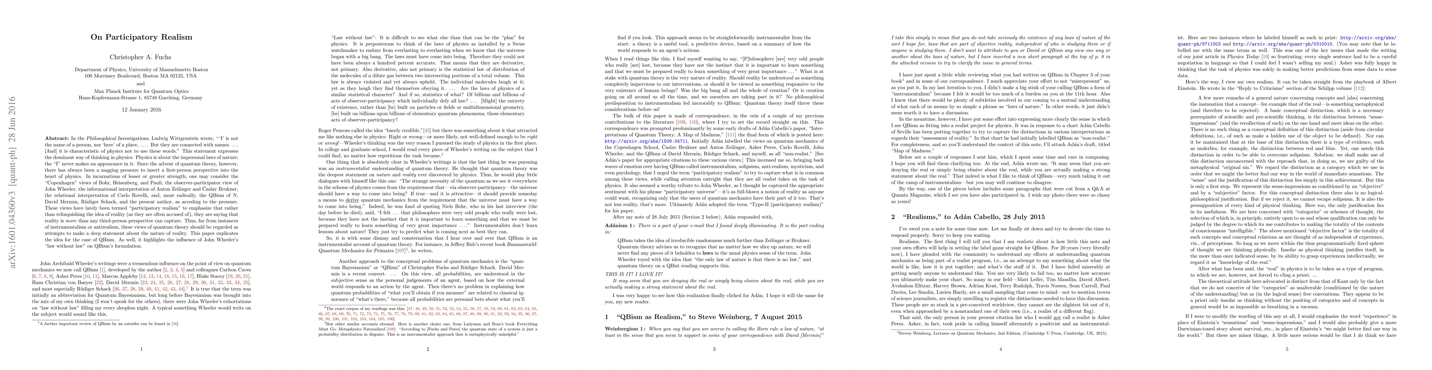 In the Philosophical Investigations, Ludwig Wittgenstein wrote, " 'I' is not the name of a person, nor 'here' of a place, .... But they are connected with names. ... [And] it is characteristic of physics not to use these words." This statement expresses the dominant way of thinking in physics: Physics is about the impersonal laws of nature; the "I" never makes an appearance in it. Since the advent of quantum theory, however, there has always been a nagging pressure to insert a first-person perspective into the heart of physics. In incarnations of lesser or greater strength, one may consider the "Copenhagen" views of Bohr, Heisenberg, and Pauli, the observer-participator view of John Wheeler, the informational interpretation of Anton Zeilinger and Caslav Brukner, the relational interpretation of Carlo Rovelli, and, most radically, the QBism of N. David Mermin, Ruediger Schack, and the present author, as acceding to the pressure. These views have lately been termed "participatory realism" to emphasize that rather than relinquishing the idea of reality (as they are often accused of), they are saying that reality is more than any third-person perspective can capture. Thus, far from instances of instrumentalism or antirealism, these views of quantum theory should be regarded as attempts to make a deep statement about the nature of reality. This paper explicates the idea for the case of QBism. As well, it highlights the influence of John Wheeler's "law without law" on QBism's formulation.