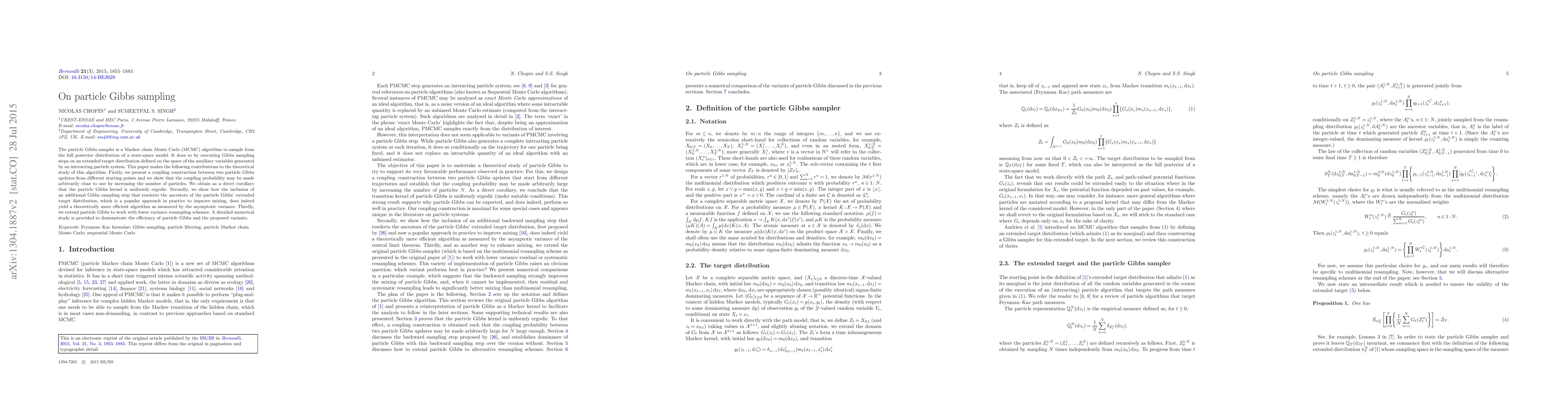 This paper explores the theoretical underpinnings of the particle Gibbs sampler, demonstrating its uniform ergodicity through a coupling construction. It also shows that incorporating an additional Gibbs sampling step improves efficiency, and extends the method to lower variance resampling schemes, supported by numerical studies.