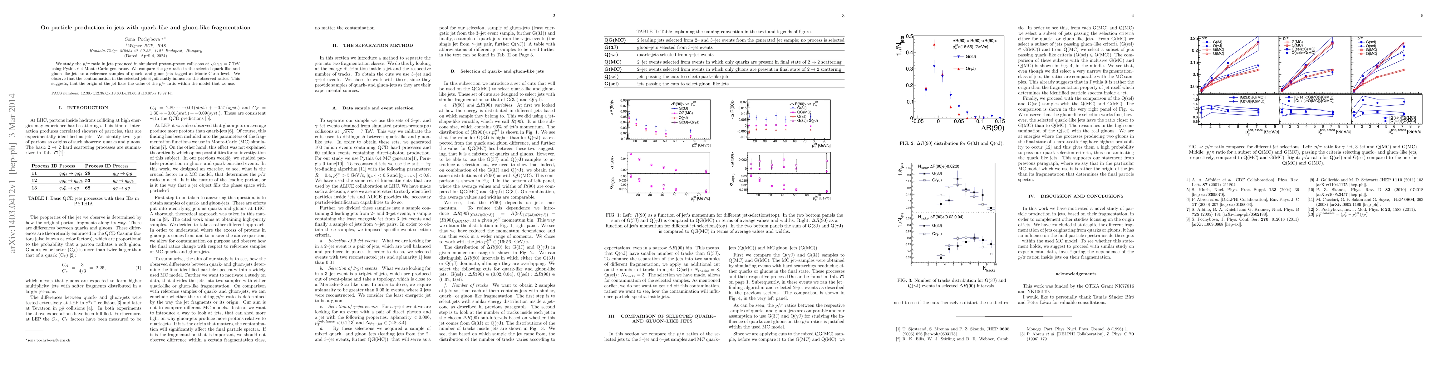 We study the $p/\pi$ ratio in jets produced in simulated proton-proton collisions at $\sqrt{s_{NN}}=7~\mathrm{TeV}$ using Pythia $6.4$ Monte-Carlo generator. We compare the $p/\pi$ ratio in the selected quark-like and gluon-like jets to a reference samples of quark- and gluon-jets tagged at Monte-Carlo level. We observe that the contamination in the selected jets significantly influences the observed ratios. This suggests, that the origin of the jet fixes the value of the $p/\pi$ ratio within the model that we use.