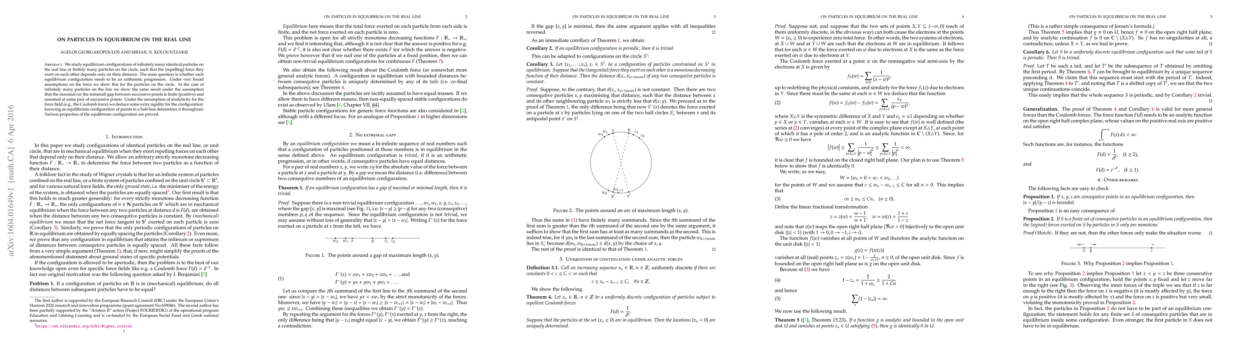 We study equilibrium configurations of infinitely many identical particles on the real line or finitely many particles on the circle, such that the (repelling) force they exert on each other depends only on their distance. The main question is whether each equilibrium configuration needs to be an arithmetic progression. Under very broad assumptions on the force we show this for the particles on the circle. In the case of infinitely many particles on the line we show the same result under the assumption that the maximal (or the minimal) gap between successive points is finite (positive) and assumed at some pair of successive points. Under the assumption of analyticity for the force field (e.g., the Coulomb force) we deduce some extra rigidity for the configuration: knowing an equilibrium configuration of points in a half-line determines it throughout. Various properties of the equlibrium configuration are proved.
