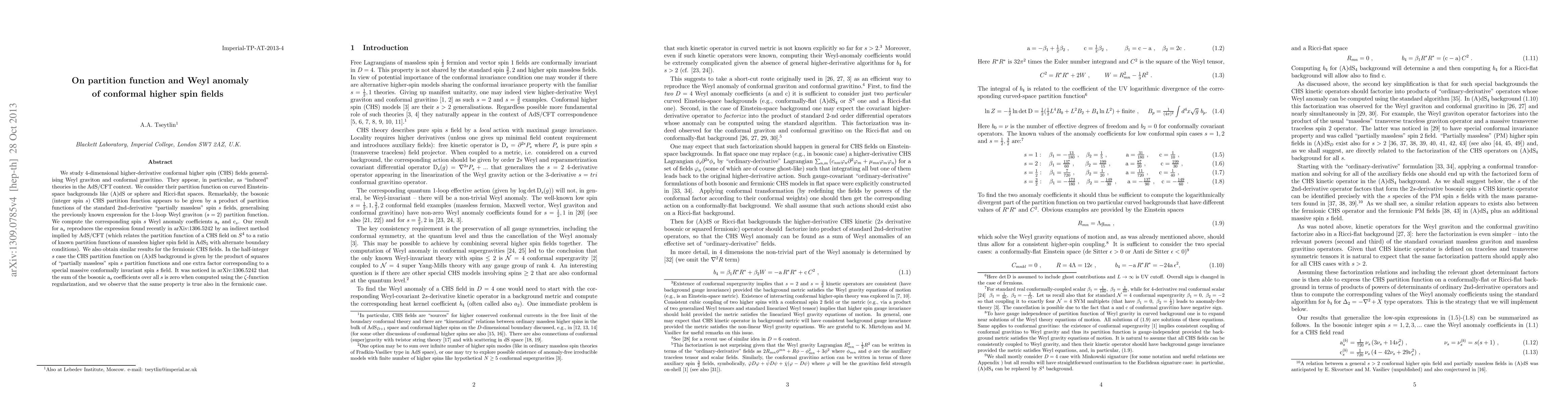 This paper investigates the partition functions and Weyl anomalies of conformal higher spin fields in 4 dimensions, extending beyond the Weyl graviton and conformal gravitino. The authors find that the partition functions for bosonic and fermionic higher spin fields can be expressed in terms of products of partition functions of partially massless spin fields, with additional factors for fermionic cases. They also confirm the consistency of these theories at the quantum level through the vanishing sum of bosonic Weyl anomaly coefficients.