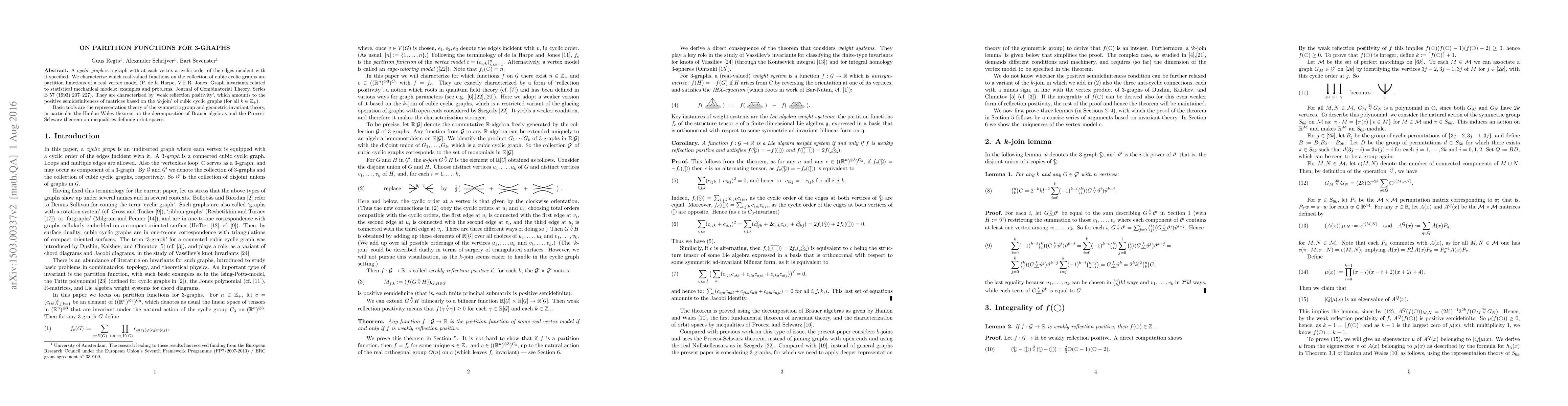 A {\em cyclic graph} is a graph with at each vertex a cyclic order of the edges incident with it specified. We characterize which real-valued functions on the collection of cubic cyclic graphs are partition functions of a real vertex model (P. de la Harpe, V.F.R. Jones, Graph invariants related to statistical mechanical models: examples and problems, Journal of Combinatorial Theory, Series B 57 (1993) 207--227). They are characterized by `weak reflection positivity', which amounts to the positive semidefiniteness of matrices based on the `$k$-join' of cubic cyclic graphs (for all $k\in\oZ_+$). Basic tools are the representation theory of the symmetric group and geometric invariant theory, in particular the Hanlon-Wales theorem on the decomposition of Brauer algebras and the Procesi-Schwarz theorem on inequalities defining orbit spaces.