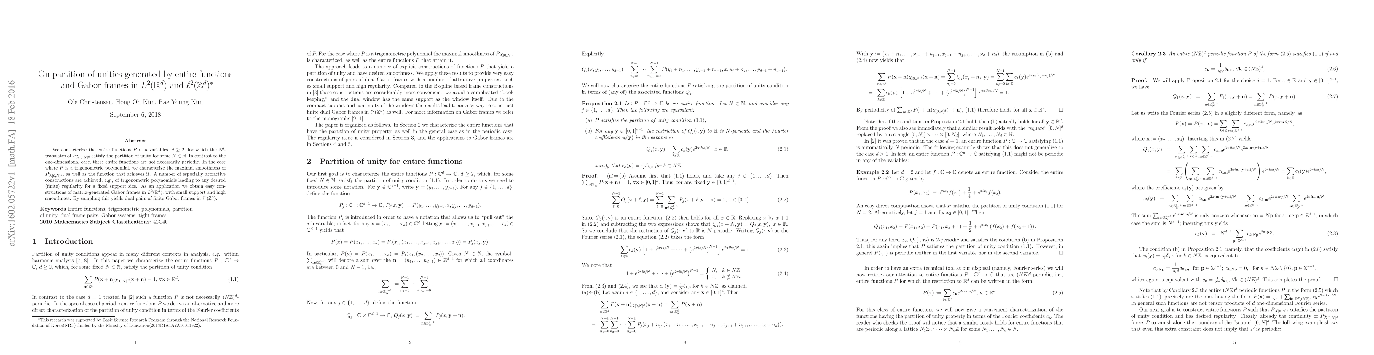 This paper characterizes entire functions generating partitions of unity through their $\mzd$-translates in $\ltrd$ and $\ell^2(\mzd)$. It provides constructions of trigonometric polynomials achieving desired regularity, leading to matrix-generated Gabor frames with high smoothness and small support, and dual pairs of finite Gabor frames in $\ell^2(\mzd)$.
