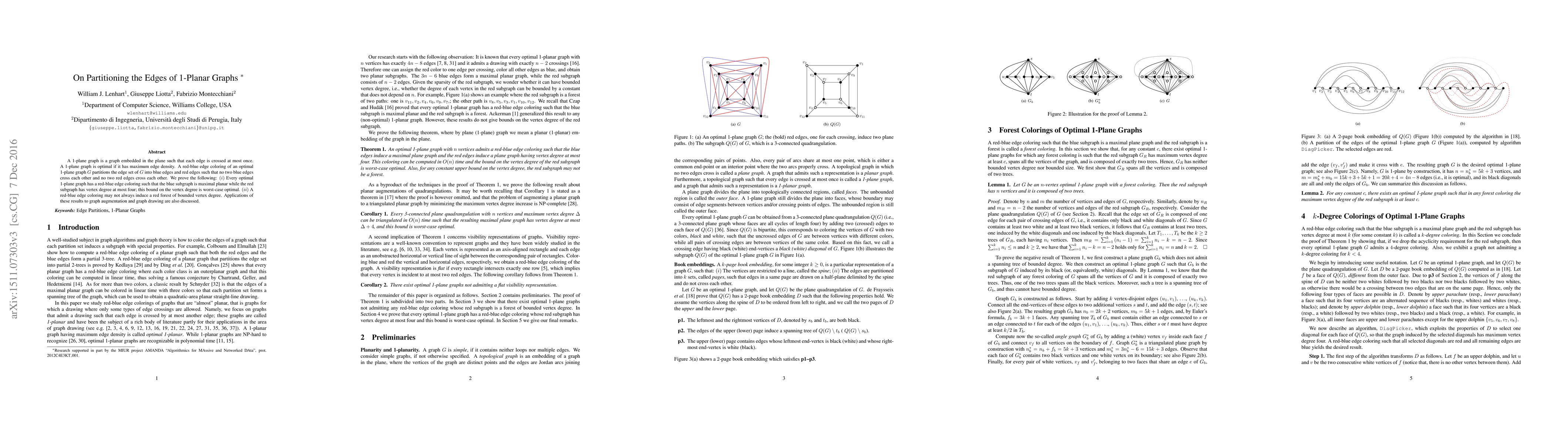 A 1-plane graph is a graph embedded in the plane such that each edge is crossed at most once. A 1-plane graph is optimal if it has maximum edge density. A red-blue edge coloring of an optimal 1-plane graph $G$ partitions the edge set of $G$ into blue edges and red edges such that no two blue edges cross each other and no two red edges cross each other. We prove the following: $(i)$ Every optimal 1-plane graph has a red-blue edge coloring such that the blue subgraph is maximal planar while the red subgraph has vertex degree at most four; this bound on the vertex degree is worst-case optimal. $(ii)$ A red-blue edge coloring may not always induce a red forest of bounded vertex degree. Applications of these results to graph augmentation and graph drawing are also discussed.