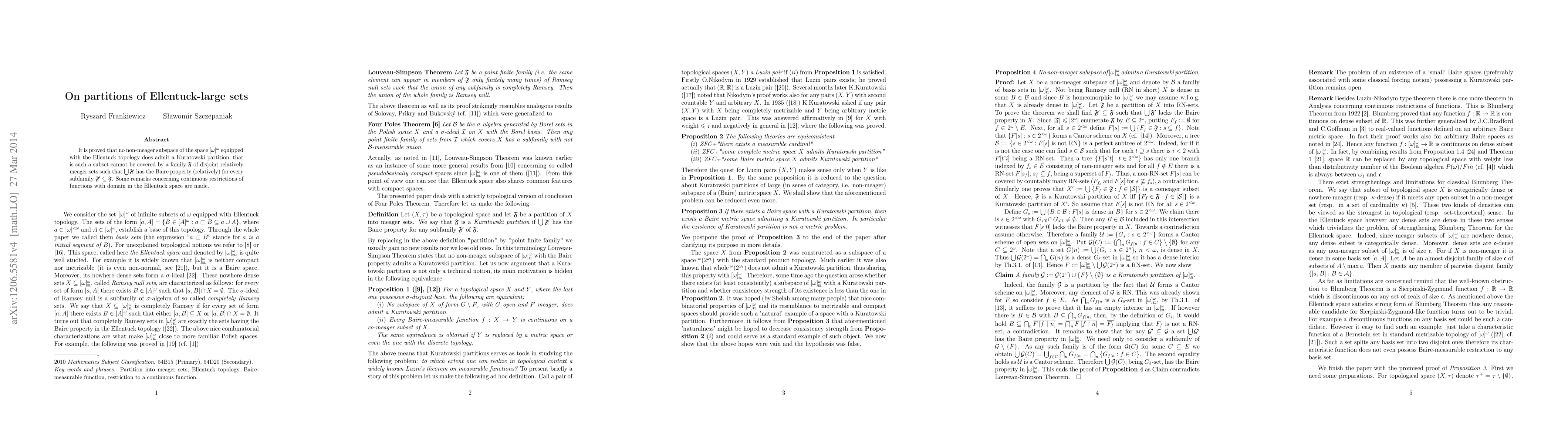 This paper proves that no non-meager subspace of the Ellentuck topology on $[\omega]^\omega$ can be partitioned into a family of disjoint relatively meager sets with certain Baire property conditions. It also demonstrates that the existence of such partitions is not a metric issue.