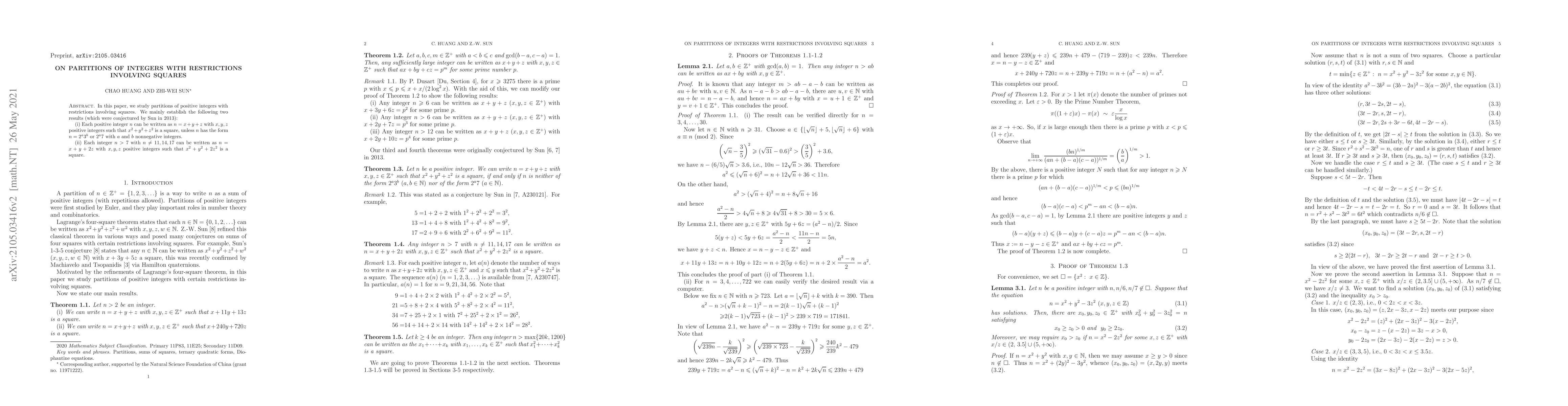 In this paper, we study partitions of positive integers with restrictions involving squares. We mainly establish the following two results (which were conjectured by Sun in 2013): (i) Each positive integer $n$ can be written as $n=x+y+z$ with $x,y,z$ positive integers such that $x^2+y^2+z^2$ is a square, unless $n$ has the form $n=2^{a}3^{b}$ or $2^{a}7$ with $a$ and $b$ nonnegative integers. (ii) Each integer $n>7$ with $n\not=11,14,17$ can be written as $n=x+y+2z$ with $x,y,z$ positive integers such that $x^2+y^2+2z^2$ is a square.