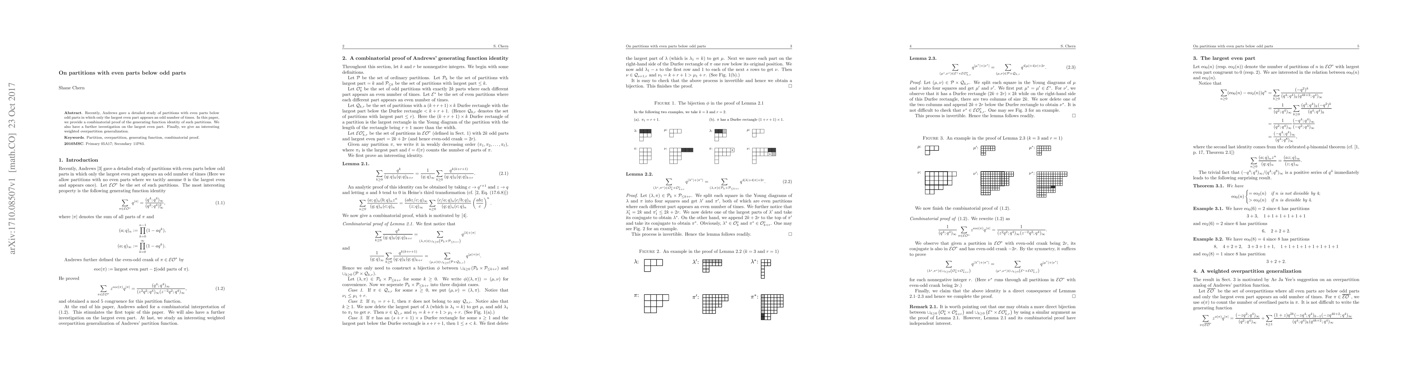 This paper provides a combinatorial proof for the generating function identity of partitions with even parts below odd parts, where the largest even part occurs an odd number of times. It also explores the largest even part further and introduces a weighted overpartition generalization.