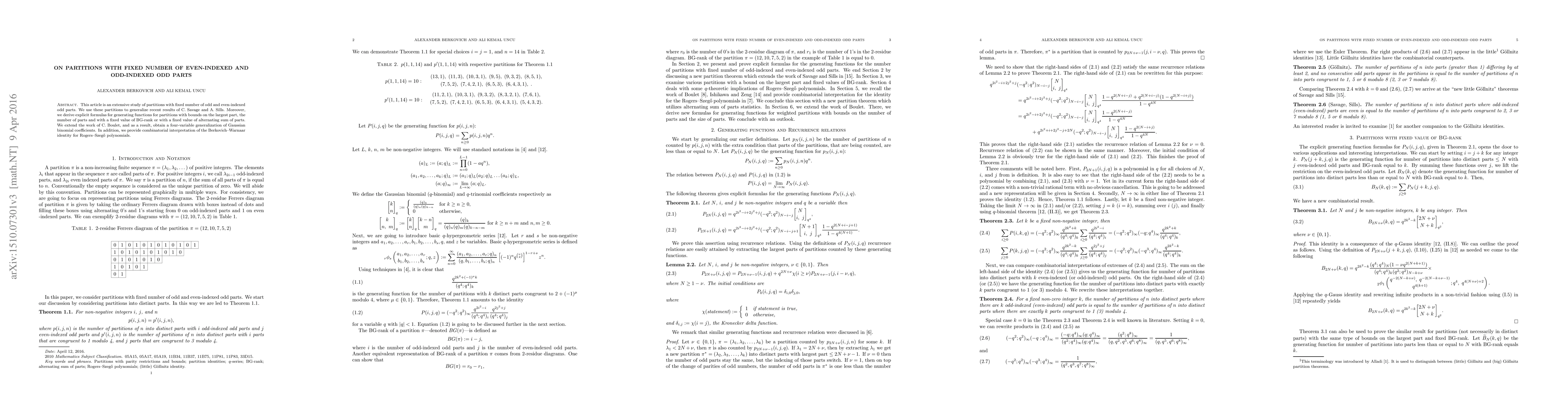 This paper studies partitions with a fixed number of even-indexed and odd-indexed odd parts, deriving explicit generating functions and generalizing results from previous works. It also extends Gaussian binomial coefficients and provides a combinatorial interpretation for the Berkovich-Warnaar identity for Rogers-Szego polynomials.