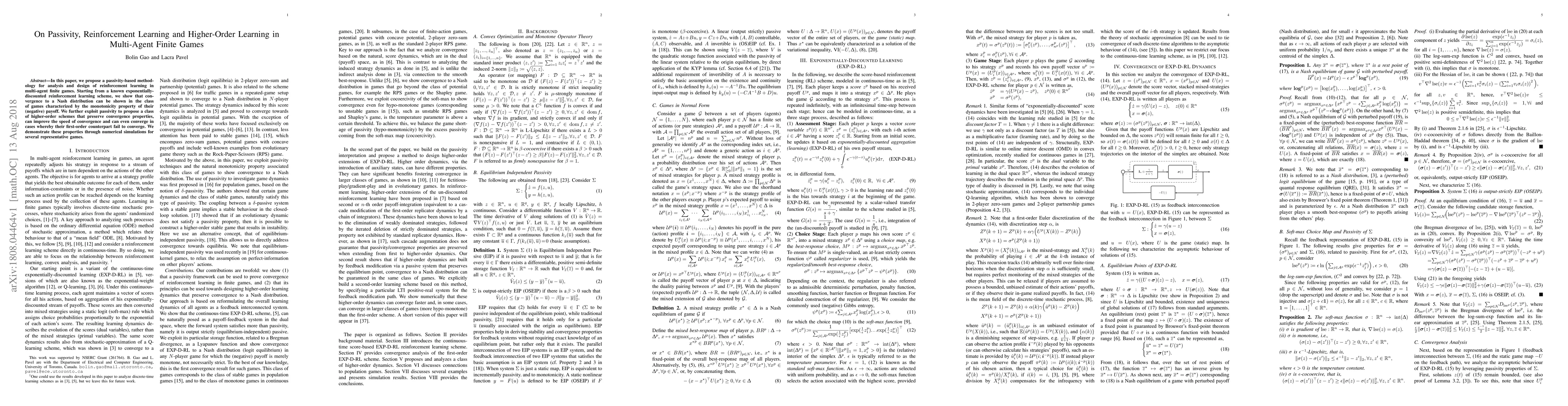 This paper introduces a passivity-based approach for analyzing and designing reinforcement learning in multi-agent finite games, demonstrating convergence to Nash equilibrium under monotonicity conditions. It also proposes higher-order learning schemes that enhance convergence speed and success in scenarios where first-order methods fail, validated through numerical simulations.
