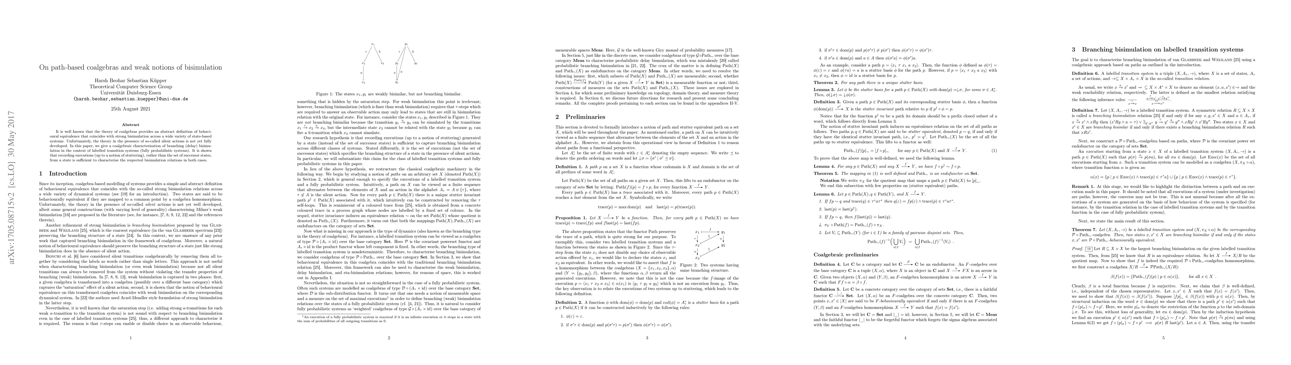 It is well known that the theory of coalgebras provides an abstract definition of behavioural equivalence that coincides with strong bisimulation across a wide variety of state-based systems. Unfortunately, the theory in the presence of so-called silent actions is not yet fully developed. In this paper, we give a coalgebraic characterisation of branching bisimulation in the context of labelled transition systems and fully probabilistic systems. It is shown that recording executions (up to a notion of stuttering), rather than the set of successor states, from a state is sufficient to characterise branching bisimulation in both cases.