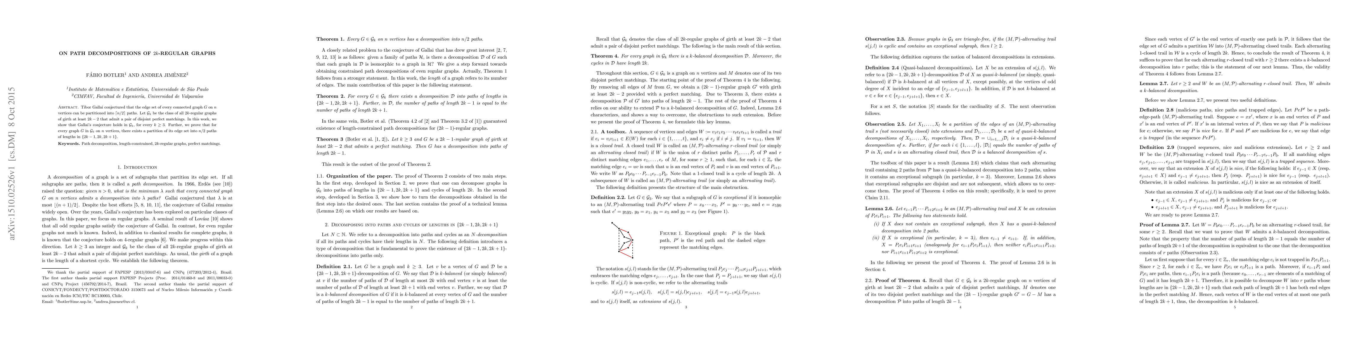 Tibor Gallai conjectured that the edge set of every connected graph $G$ on $n$ vertices can be partitioned into $\lceil n/2\rceil$ paths. Let $\mathcal{G}_{k}$ be the class of all $2k$-regular graphs of girth at least $2k-2$ that admit a pair of disjoint perfect matchings. In this work, we show that Gallai's conjecture holds in $\mathcal{G}_{k}$, for every $k \geq 3$. Further, we prove that for every graph $G$ in $\mathcal{G}_{k}$ on $n$ vertices, there exists a partition of its edge set into $n/2$ paths of lengths in $\{2k-1,2k,2k+1\}$.