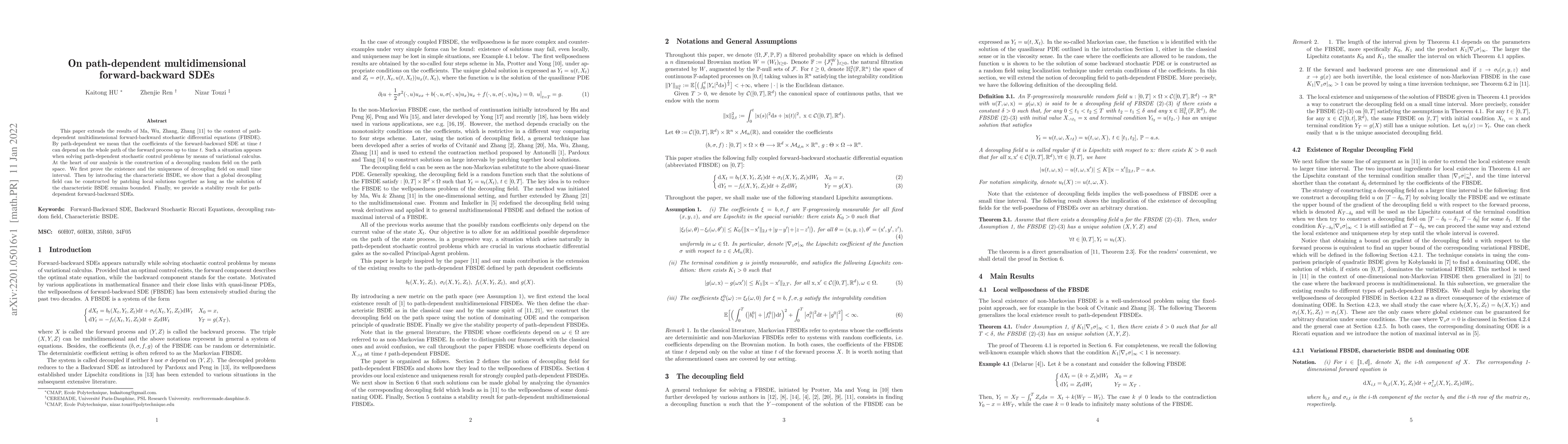 This paper extends the results of Ma, Wu, Zhang, Zhang [11] to the context of path-dependent multidimensional forward-backward stochastic differential equations (FBSDE). By path-dependent we mean that the coefficients of the forward-backward SDE at time t can depend on the whole path of the forward process up to time t. Such a situation appears when solving path-dependent stochastic control problems by means of variational calculus. At the heart of our analysis is the construction of a decoupling random field on the path space. We first prove the existence and the uniqueness of decoupling field on small time interval. Then by introducing the characteristic BSDE, we show that a global decoupling field can be constructed by patching local solutions together as long as the solution of the characteristic BSDE remains bounded. Finally, we provide a stability result for path-dependent forward-backward SDEs.