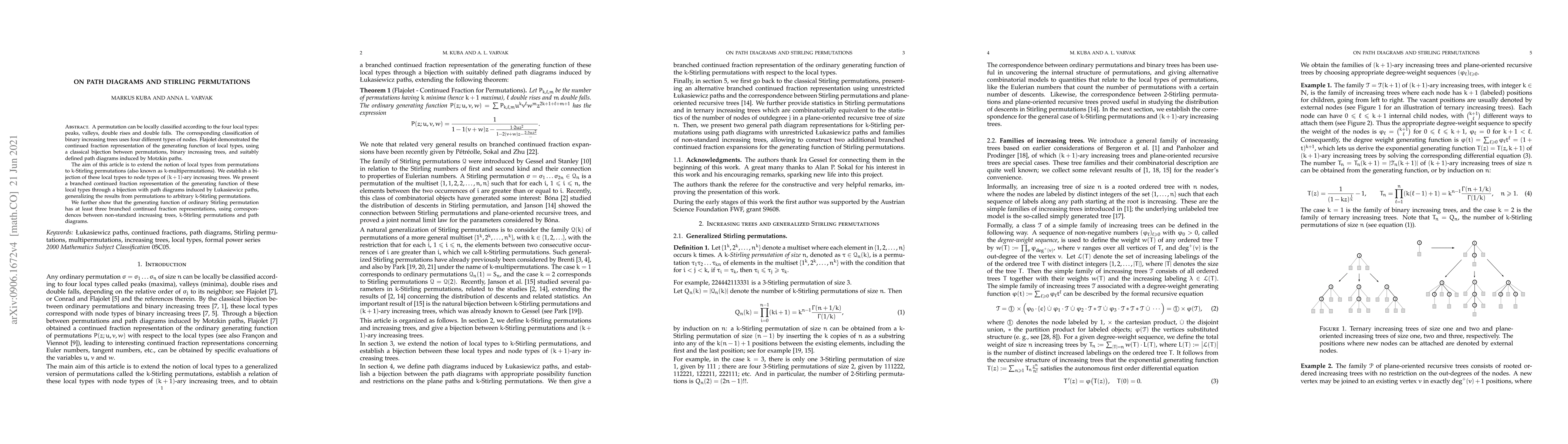 A permutation can be locally classified according to the four local types: peaks, valleys, double rises and double falls. The corresponding classification of binary increasing trees uses four different types of nodes. Flajolet demonstrated the continued fraction representation of the generating function of local types, using a classical bijection between permutations, binary increasing trees, and suitably defined path diagrams induced by Motzkin paths. The aim of this article is to extend the notion of local types from permutations to $k$-Stirling permutations (also known as $k$-multipermutations). We establish a bijection of these local types to node types of $(k+1)$-ary increasing trees. We present a branched continued fraction representation of the generating function of these local types through a bijection with path diagrams induced by \L ukasiewicz paths, generalizing the results from permutations to arbitrary $k$-Stirling permutations. We further show that the generating function of ordinary Stirling permutation has at least three branched continued fraction representations, using correspondences between non-standard increasing trees, $k$-Stirling permutations and path diagrams.