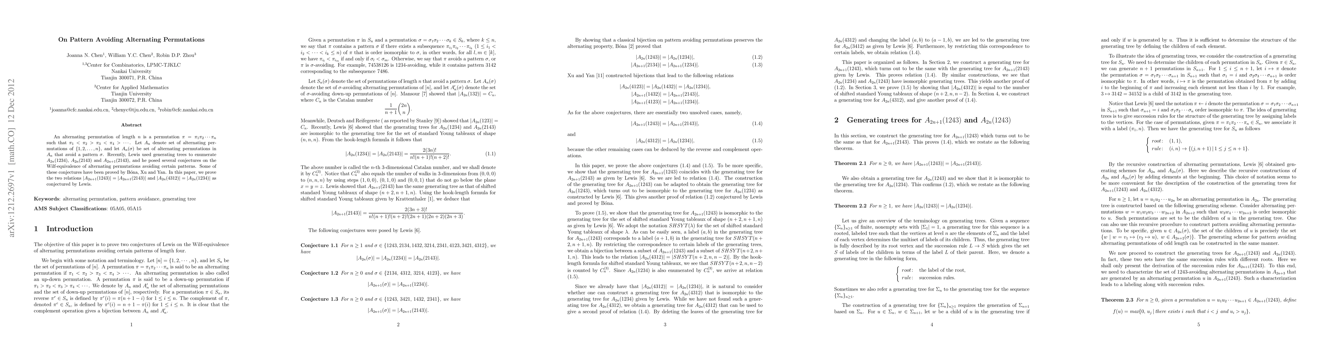 This paper proves the conjectured relations $|A_{2n+1}(1243)|=|A_{2n+1}(2143)|$ and $|A_{2n}(4312)|=|A_{2n}(1234)|$ concerning the number of alternating permutations that avoid specific patterns, following up on earlier work by Lewis and subsequent proofs by B\'ona, Xu, and Yan.