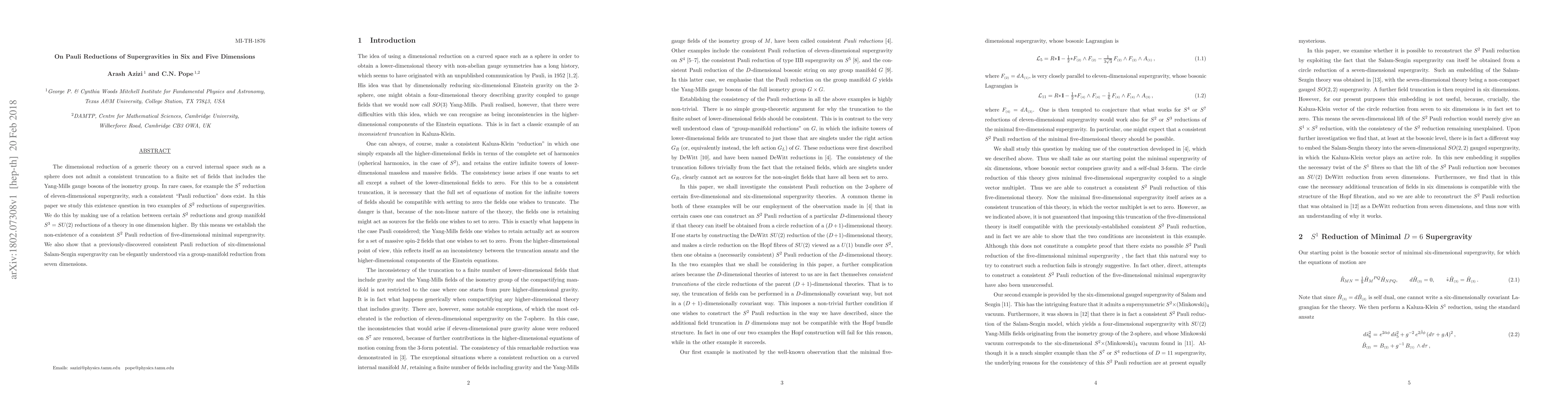 This paper investigates the non-existence of Pauli reductions in $S^2$ reductions of five-dimensional supergravity and confirms the consistency of a previously discovered reduction in six-dimensional Salam-Sezgin supergravity via a group-manifold reduction from seven dimensions.